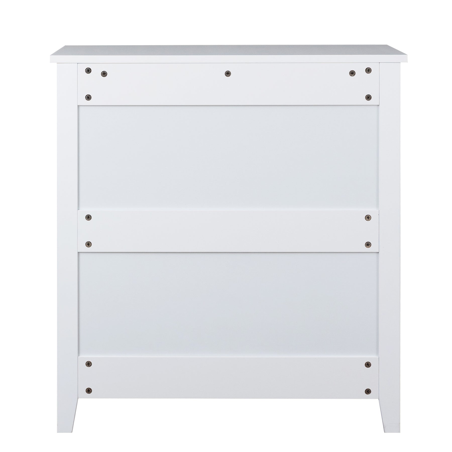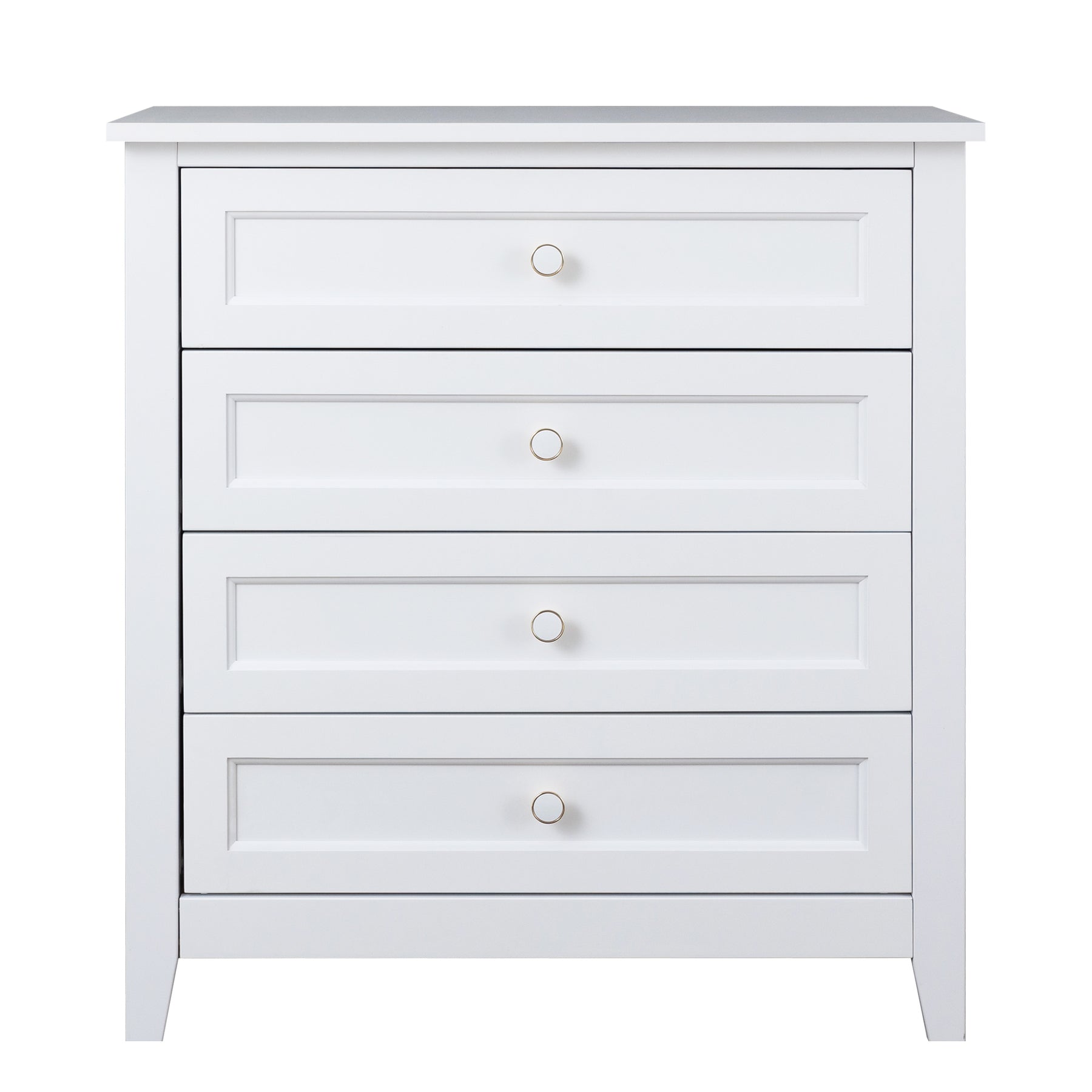 Feature:Elevate your home decor with this spacious 4-drawer sideboard. It offers ample storage and features a beautiful white finish that complements any bedroom, cloakroom, or living room.Product Description:This dresser has a mid-century modern design that adds some style and flair to your room. It has white round handles and a sleek shape that complements any decor.  It's a sturdy and reliable closet dresser that offers both style and functionality.This modern chest has 4 large drawers, which can meet all your storage needs. They can be neatly placed inside to help you sort items by type, and keep all things in order, and you can save a lot of time when picking up items. The wooden top can provide a stable surface for placing lamps, books, decorations, etc.Crafted with environmental protection water-based paint, this sideboard not only enhances your living space but also prioritizes eco-friendliness. Its solid wood appearance, complemented by retro round handles and legs, adds a timeless charm.The set comes complete with all the accessories needed for assembly. It also comes with easy-to-understand instructions that you can follow. It only takes 10-15 minutes to set up and install. Product Specification:Color: WhiteMaterial: Solid Wood, MDFSize: 32.68 x 17.72 x 35.55 inchesFunction: Home FurniturePackage Inclusion:1 x Dresser1 x Assembly Kit