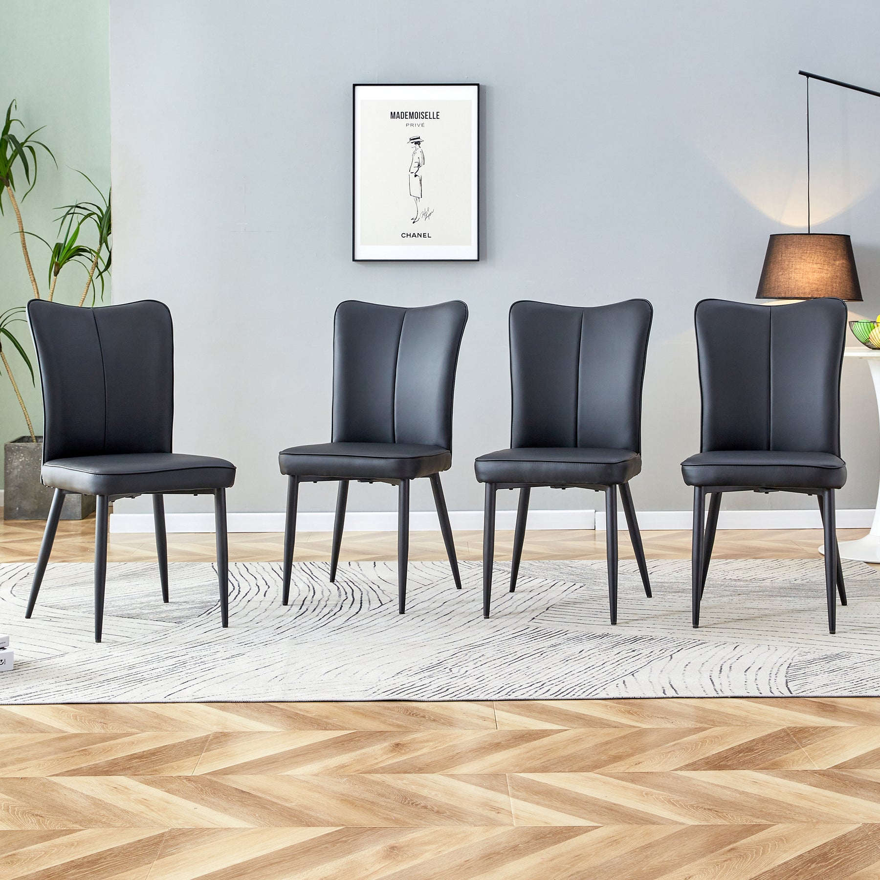 Feature:Experience the perfect blend of aesthetics and comfort with these modern design dining chairs. The elegantly curved silhouette adds sophistication to any dining space.Product Description:The upholstered high-back design is not only visually appealing but also provides excellent support for your spine. Made of anti-bend construction, the backrest retains its shape even after prolonged use. Made of sturdy metal frame material, ensuring durability and long-lasting use. The chair legs are equipped with non-slip plastic pads on the bottom to protect your floors and carpets from unsightly scratches. The dining room chair features soft cushions and soft-touch artificial leather fabric. It creates a warm and inviting atmosphere while adding elegance and style to your restaurants and offices. The set comes complete with all the accessories needed for assembly. It also comes with easy-to-understand instructions that you can follow. It only takes 10-15 minutes to set up and install. Product Specification:Color: BlackMaterial: PUSize: 17.30 x 17.70 x 35 inchesWeight: 29kgFunction: Home FurniturePackage Inclusion:4 x Dining Chairs1 x Installation Kit