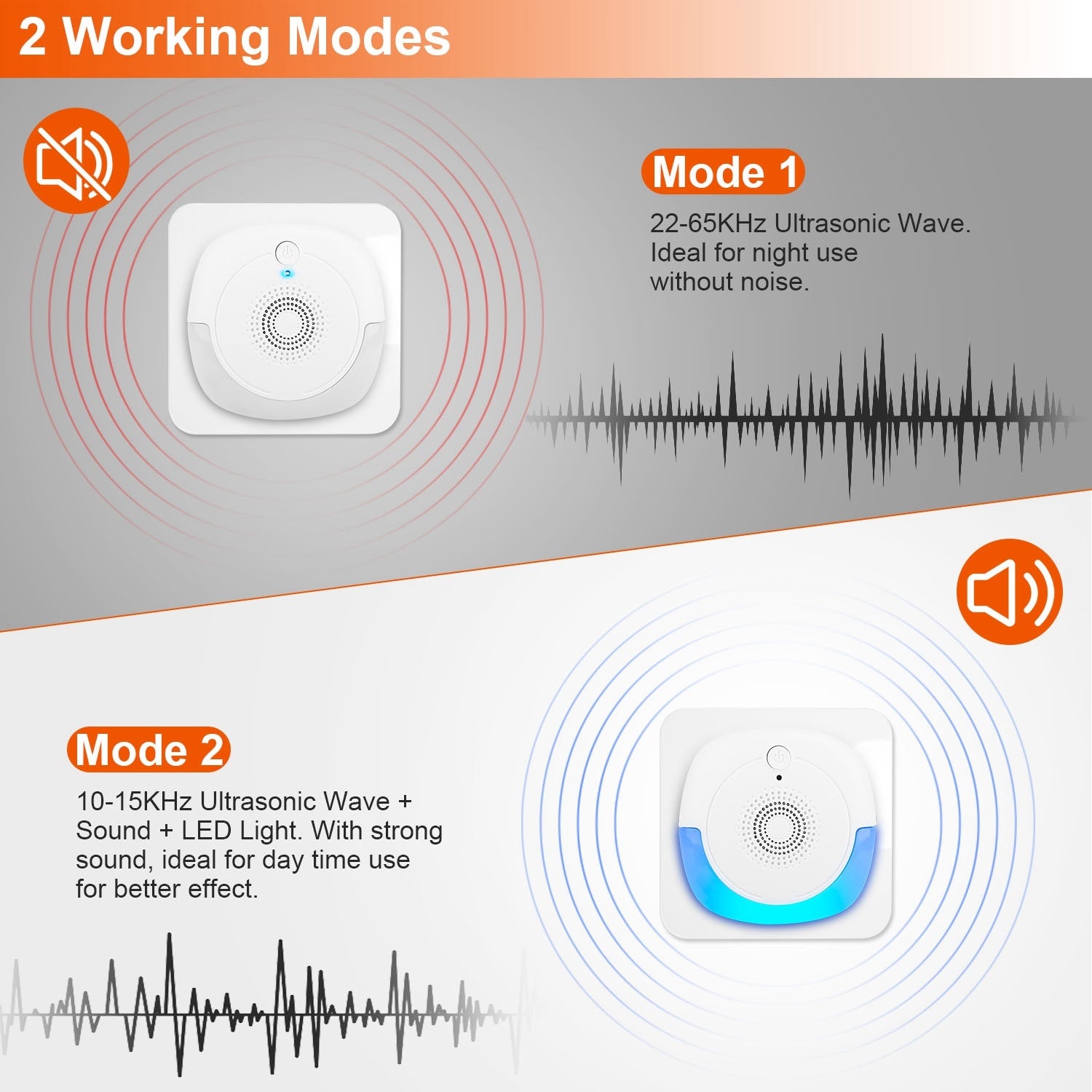 *Dual Working Modes*:Press the button once; it'll turn on mode 1 and emit ultrasonic wave between 22-65KHz with no noise; ideal for night use; Press the button again to switch to mode 2 and emit ultrasonic wave between 10-15KHz and sound simultaneously which is perfect to use during the day.