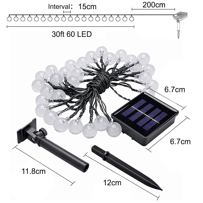 Product Description: Illuminate your outdoor area and add a different atmosphere to your parties and gatherings with these Globe Fairy LED Lights. It has 60pcs of colorful LED lights, equipped with 8 different lighting modes to suit your lighting needs.  It has an on/off button. After the switch is on, it will automatically charge the light and will turn on when it gets dark. You can control the lighting mode using a remote control, making it convenient to use.  The environmentally friendly LED solar lights use high-efficiency solar panels, converting solar energy into electric energy, saving energy and causing no environmental pollution. It helps make your home lively without incurring additional costs.  It comes with a built-in 1000mAh rechargeable battery, which will take 6-8 hours of charging time under direct sunlight, giving you 8-10 hours of usage time when fully charged.  Product Specification: Color: Colorful Material: ABS Glass Ball Diameter 1.8cm/0.7in Weight: 700g Function: Solar String Lights Charging Time: 6-8 hours Usage Time: 8-10 Battery Information: 1000mAh Voltage: 3.7V Waterproof Grade: IP65 Total length: 36 feet Number of LEDs: 60 LEDs Package Inclusion: 1 x Solar String Lights 1 x Remote Control