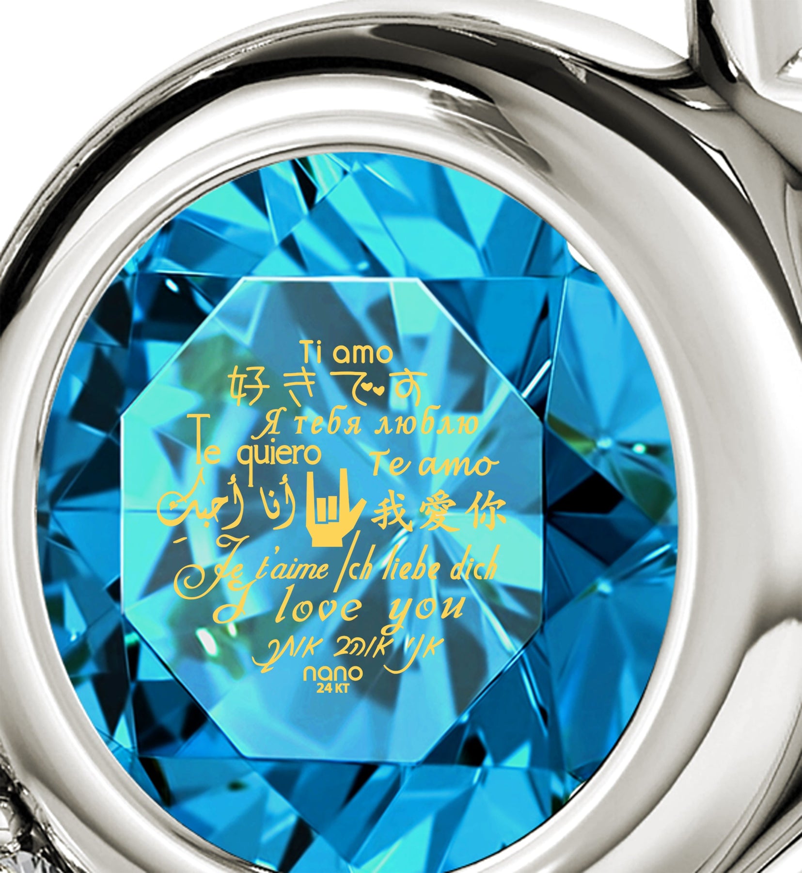 Close-up of a 925 Sterling Silver I Love You Heart Pendant Necklace with a blue gemstone inscribed with "i love you" in multiple languages, perfect as an anniversary gift.