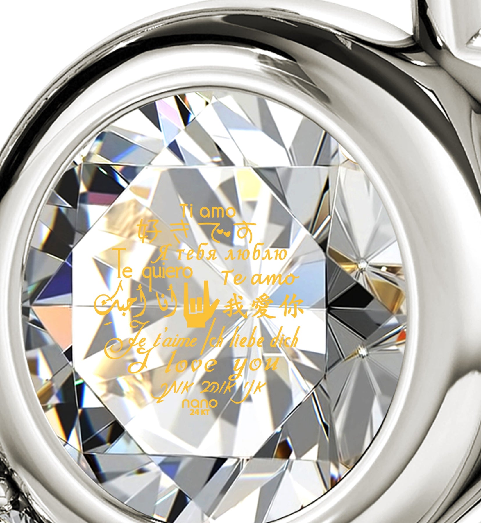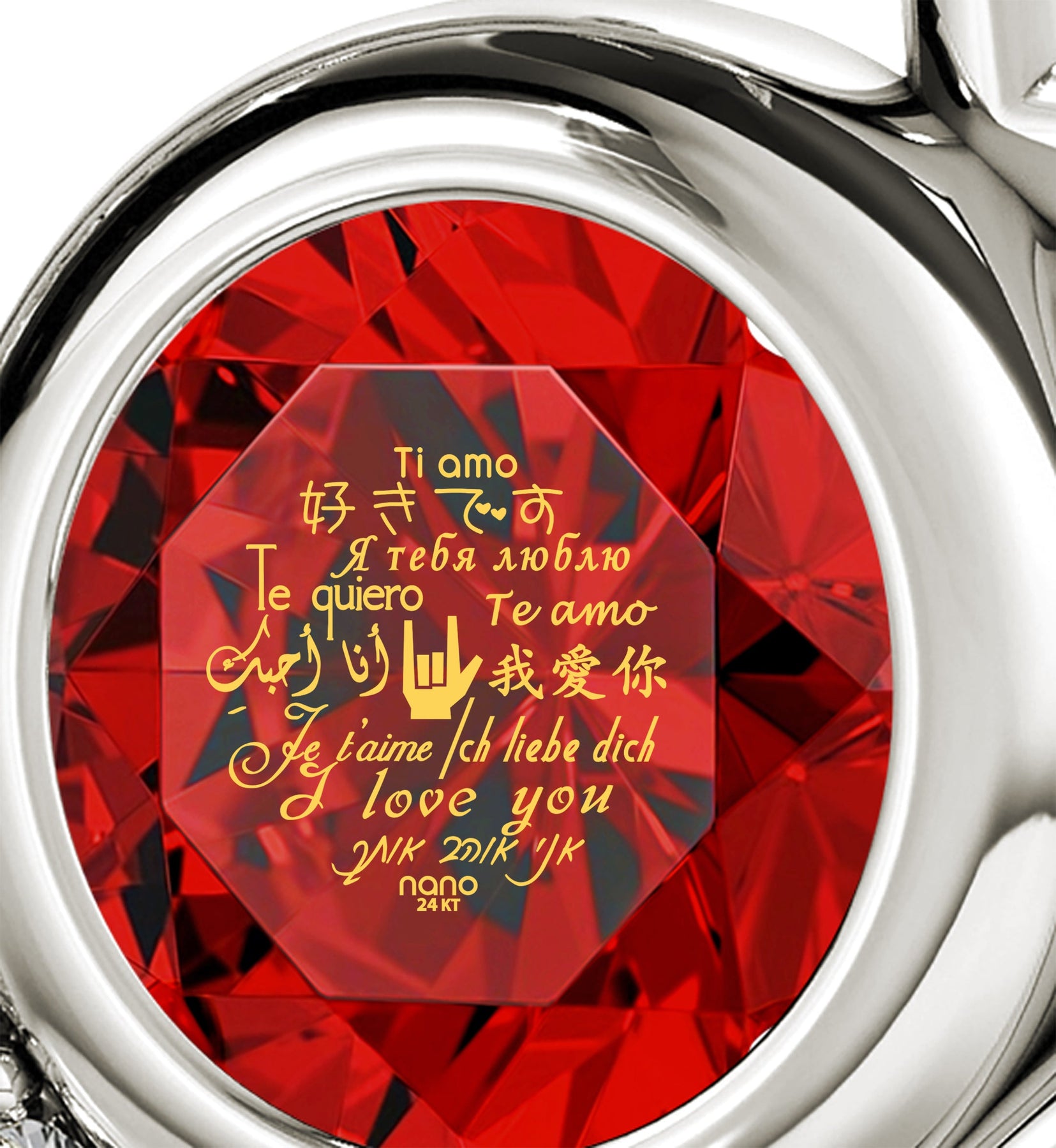 A brilliant-cut crystal Swarovski inscribed in 24k gold with the words for "I love you" in 12 different languages, set in a luxurious heart pendant embellished with 8 cubic zirconia stones. Intricate detail paired with unique design makes this stunning necklace the perfect way to say "I love you". Inscribed crystal Swarovski set in 925 sterling silver heart pendant, 1x0.65 inches, 3x1.5cm 18 inch, 45cm, high-quality Italian made 925 sterling silver chain Mini magnifying glass Jewelry gift box A truly unique gift to showcase your love for her. Our fine love jewelry makes the perfect unforgettable anniversary gift idea for her. So treat your wife, whether it's your first, fifth, 20th or 50th wedding anniversary. Surprise mom on Mother's Day, your girlfriend for Valentines Day, your daughter for Christmas or best friend on her birthday.