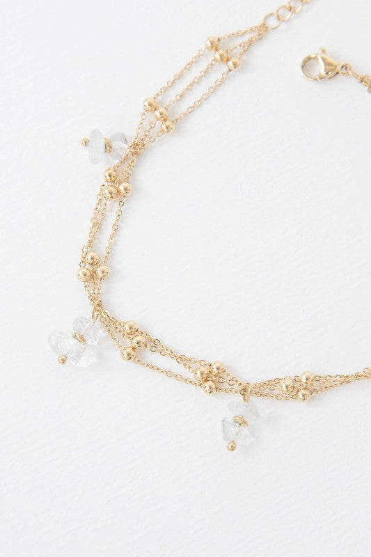 A three chained anklet with clear stone charms.Stainless Steel14k Gold PlatingMeasurement:Chain Length: 8.75in / 22.23cmExtension: 2.5in / 6.35cmStyle: SummerMaterial Composition: Stainless Steel14k Gold PlatingCare Instructions: Keep jewelry away from prolonged exposure to moisture. Before any activity, take off the jewelry and store it in a dark and dry place. This includes activities such as showering, swimming, or exercising. If the jewelry does get exposed to these conditions, rinse it under cold water and completely dry it with a dry and clean towel.