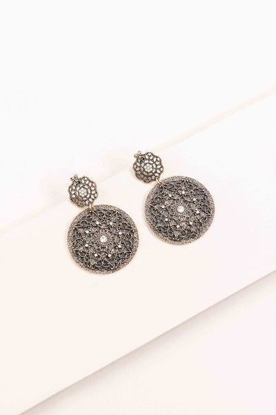 Large, round stud earrings with a shield-like drop. Lightweight statement earrings for a bold accessory. Stud backingNickel FreeMeasurements:Stud Width: .75 in. / 1.9 cm. Bottom Width: 1.75 in. / 4.44 cm. Height: 2.5 in. / 6.35 cm. Style: FormalMaterial Composition: BrassCare Instructions: Keep jewelry away from prolonged exposure to moisture. Before any activity, take off the jewelry and store it in a dark and dry place. This includes activities such as showering, swimming, or exercising. If the jewelry does get exposed to these conditions, rinse it under cold water and completely dry it with a dry and clean towel.
