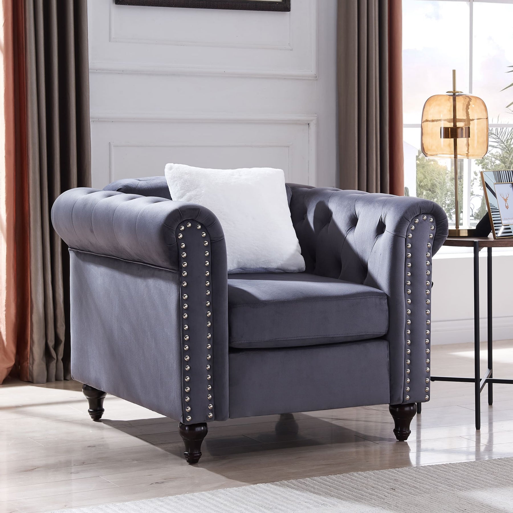 Contemporary Style Sofa Chair with Button and Copper Nail Details with Pillow- Grey