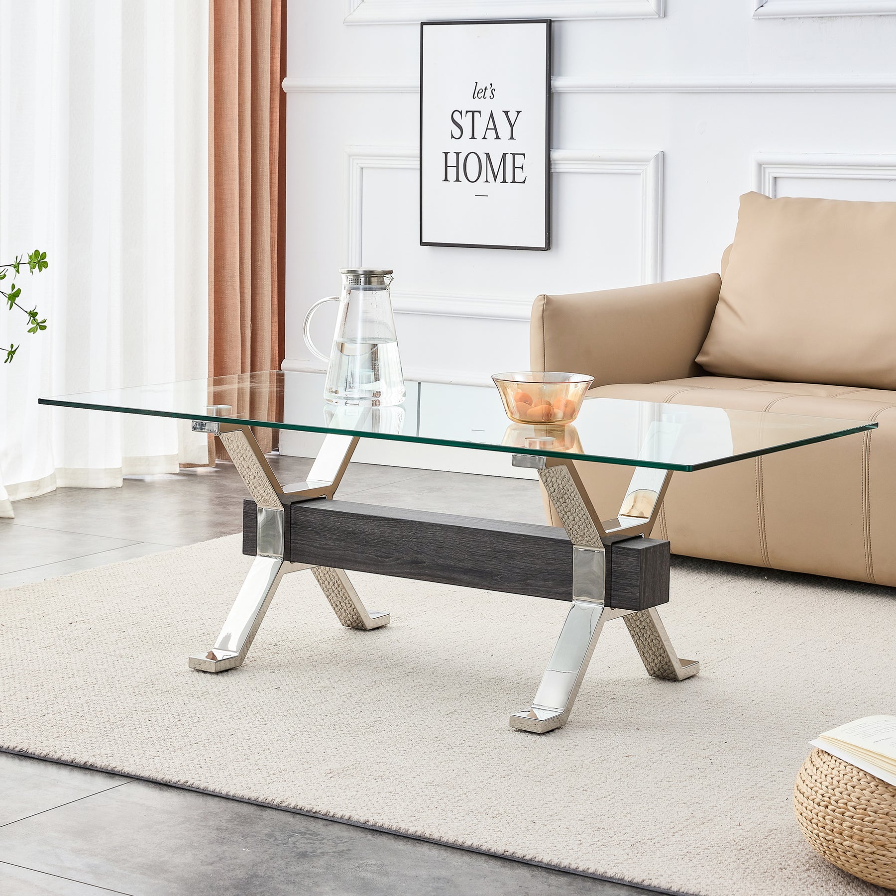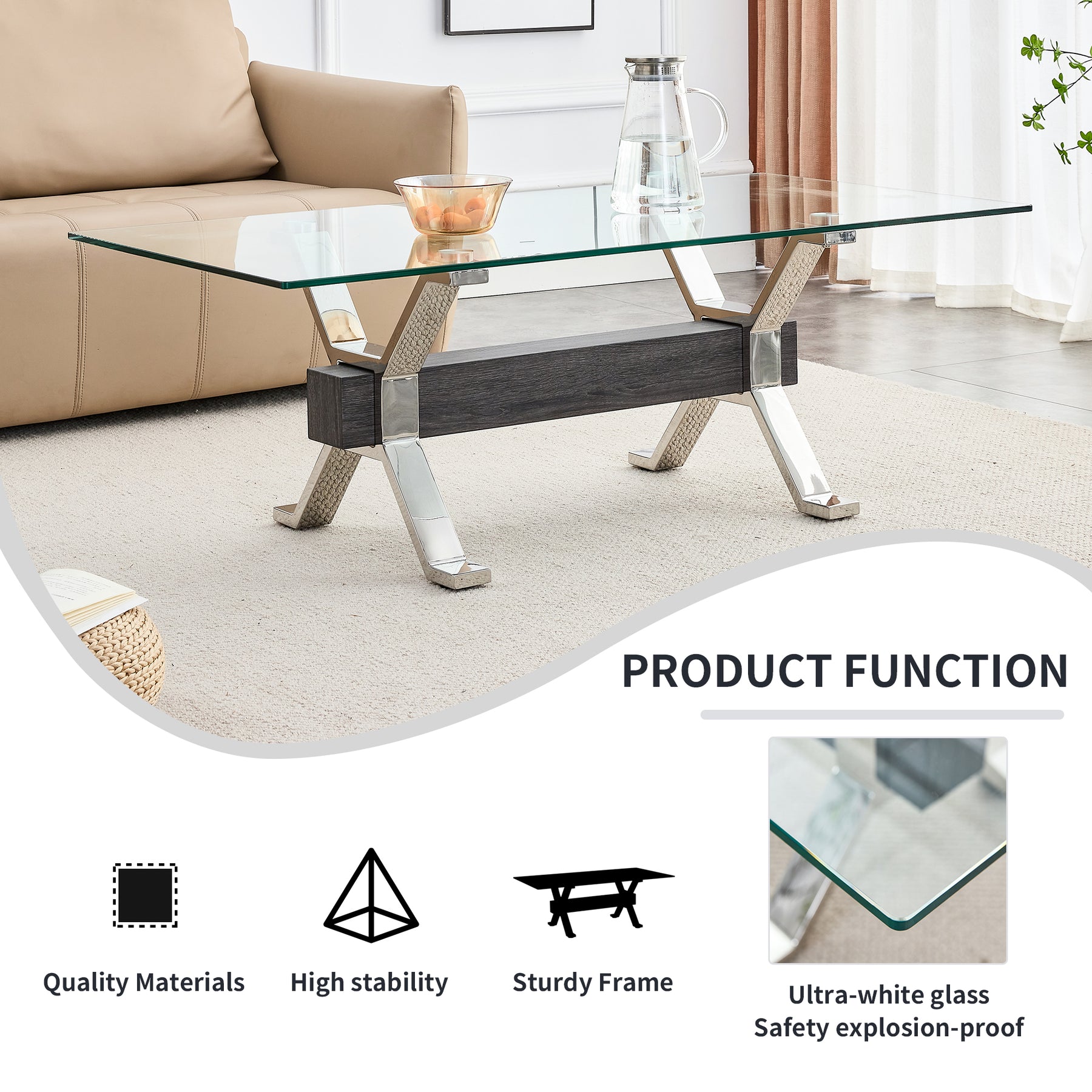 Contemporary Tempered Glass Coffee Table with Plated Metal Legs and MDF Crossbar_21
