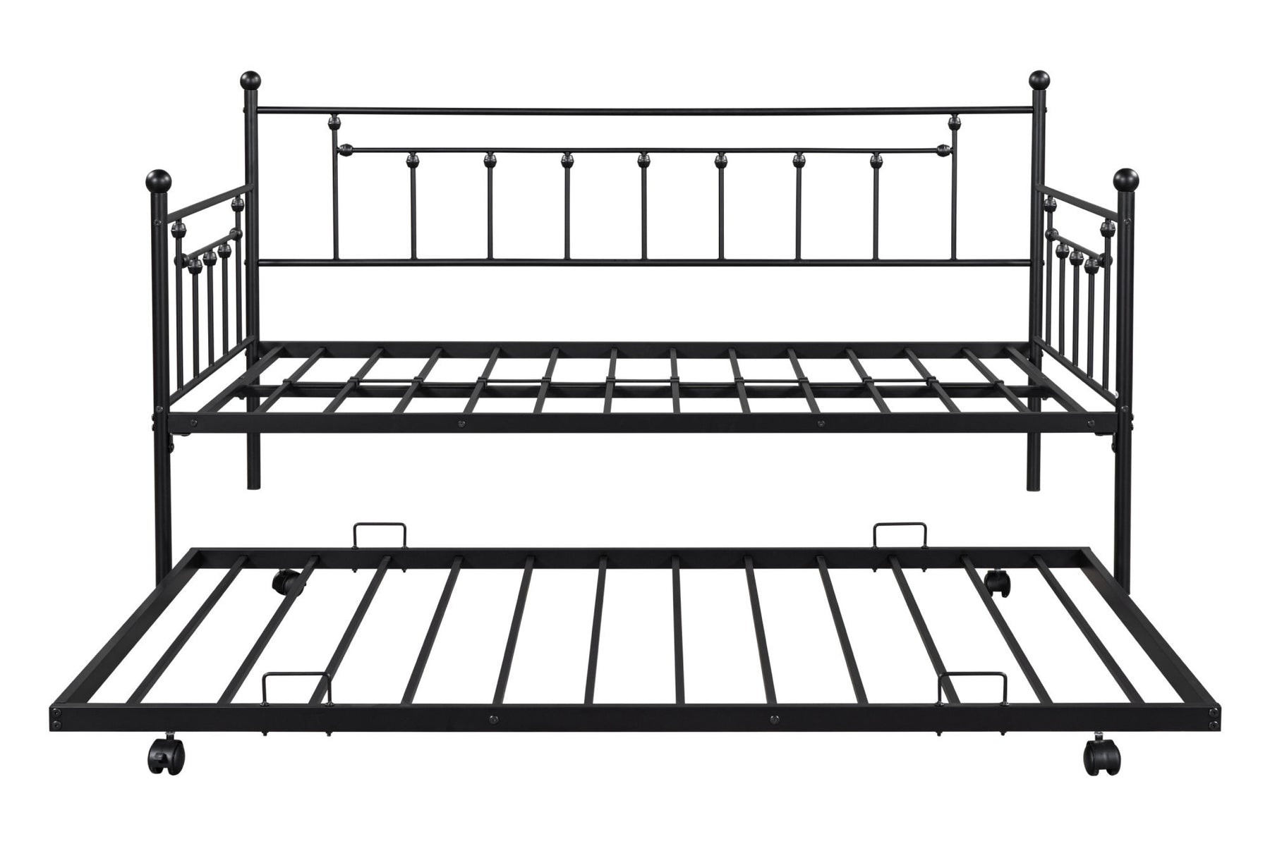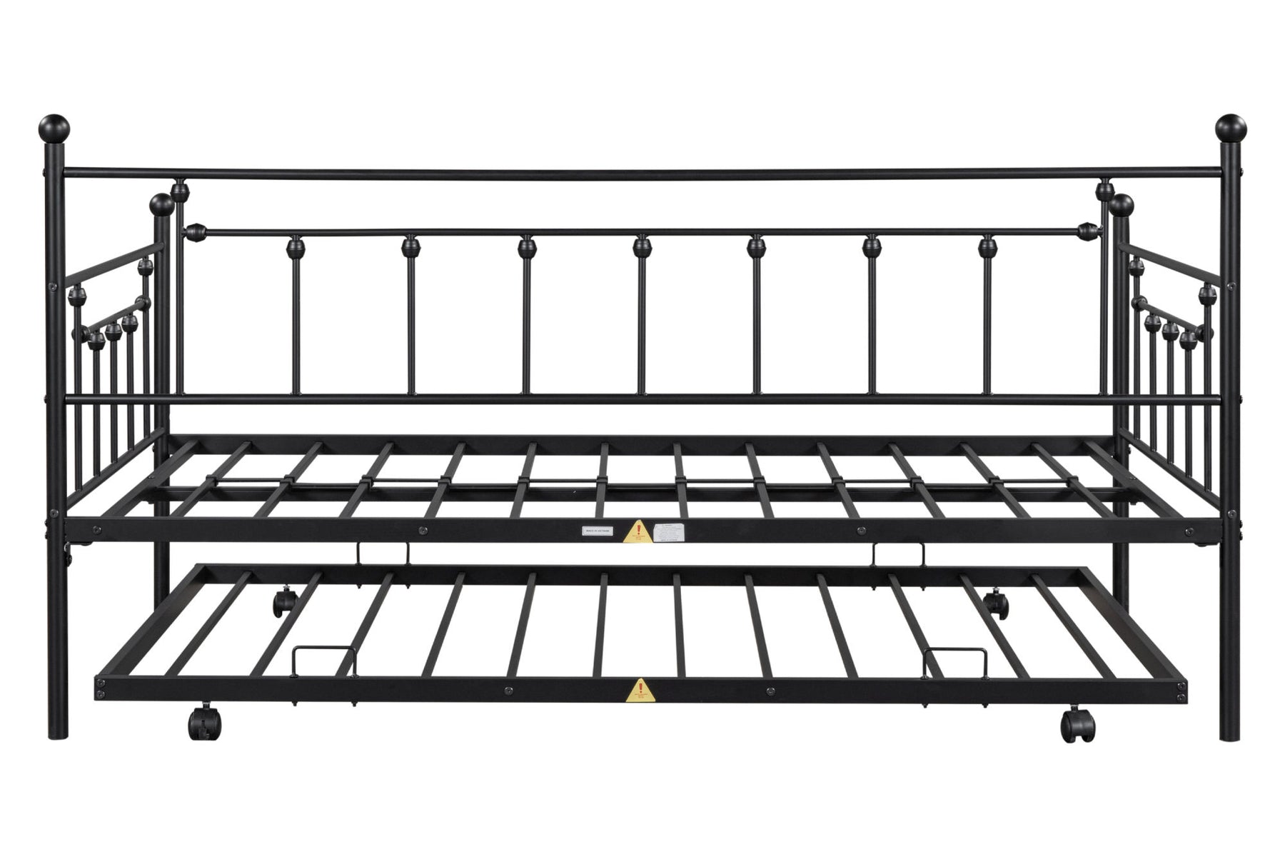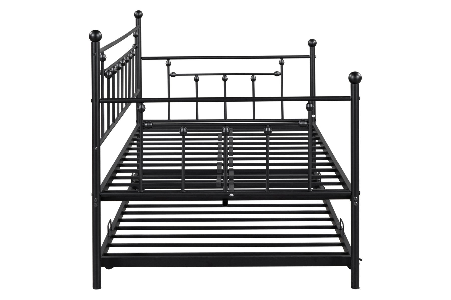 Specification Place Of Origin:Viet Nam Lithium Battery Contained:No OverSize:N Main Color:Black Main Material:Metal Details Description: Made by sturdy metal, this contemporary daybed provides extra durability and safety. Additional metal slats support mattresses and extend their life effectively. The stylish design matches every decoration of your room. It is also functional. With an extra trundle underneath the daybed, it is a great solution to provide sleeping place for guests. You can easily create your own leisure space with this daybed whether in living room or in your bedroom.   Selling points: Solid construction: Made by strong and sturdy metal provides durability and stability. The metal slats support the mattresses not to slide and allow air passing freely beneath your bed, keeping your mattress fresher longer to increase the mattresses life. Stylish design: The contemporary combined classic style provides a clean and stylish look helping complete and enhance the look of any living room or bedroom. Space saving: This multi-functional daybed with trundle is designed for rooms with limited floor space. It provides two additional sleep areas for overnight friends or family members. It gives you flexibility to accommodate a variety of options. Noise Reduced: With the design of EVA center support beam and slat lockers, we have significantly reduced squeak noise that steel beds have in common. You will have a good and quiet sleep from now on. Fast assembly: Each order comes with a clear and detailed assembly instruction guide and all necessary tools are provided to get your bed assembled in no time. Also available in White Gray. Mattresses are not included. Dimensions: Weight & Dimensions Overall Product Dimension 77.32"L x 40.94"W x 41.73"H Detail Product Dimension Trundle Bed Dimensions: 70.86"L x 40.55"W Distance Between Upper Bed and Floor: 12.99' Number of Package 1 Package Dimension 77.95 "L x 17.32 "W x 6.10 "H Overall Product Weight 51.72 LBS Package Weight 62.74 LBS Weight Capacity Daybed: 400 LBS Trundle bed : 400 LBS Recommended Mattress Thickness and Size 6'-8' Daybed : standard twin Trundle : without handle at end, the trundle can fit standard twin       Specifications: Product Type Daybed with Trundle Size Twin Color Black/ White Gray Material STEEL Box Spring Required No Number of Slats Daybed: 11 Trundle Bed : 11 Assembly Required Yes Country of Origin Vietnam Notes: Manual measurement has been used, there may be some reasonable error. All the pictures are taken by actual samples, slight chromatic aberration may occur due to lighting or display.