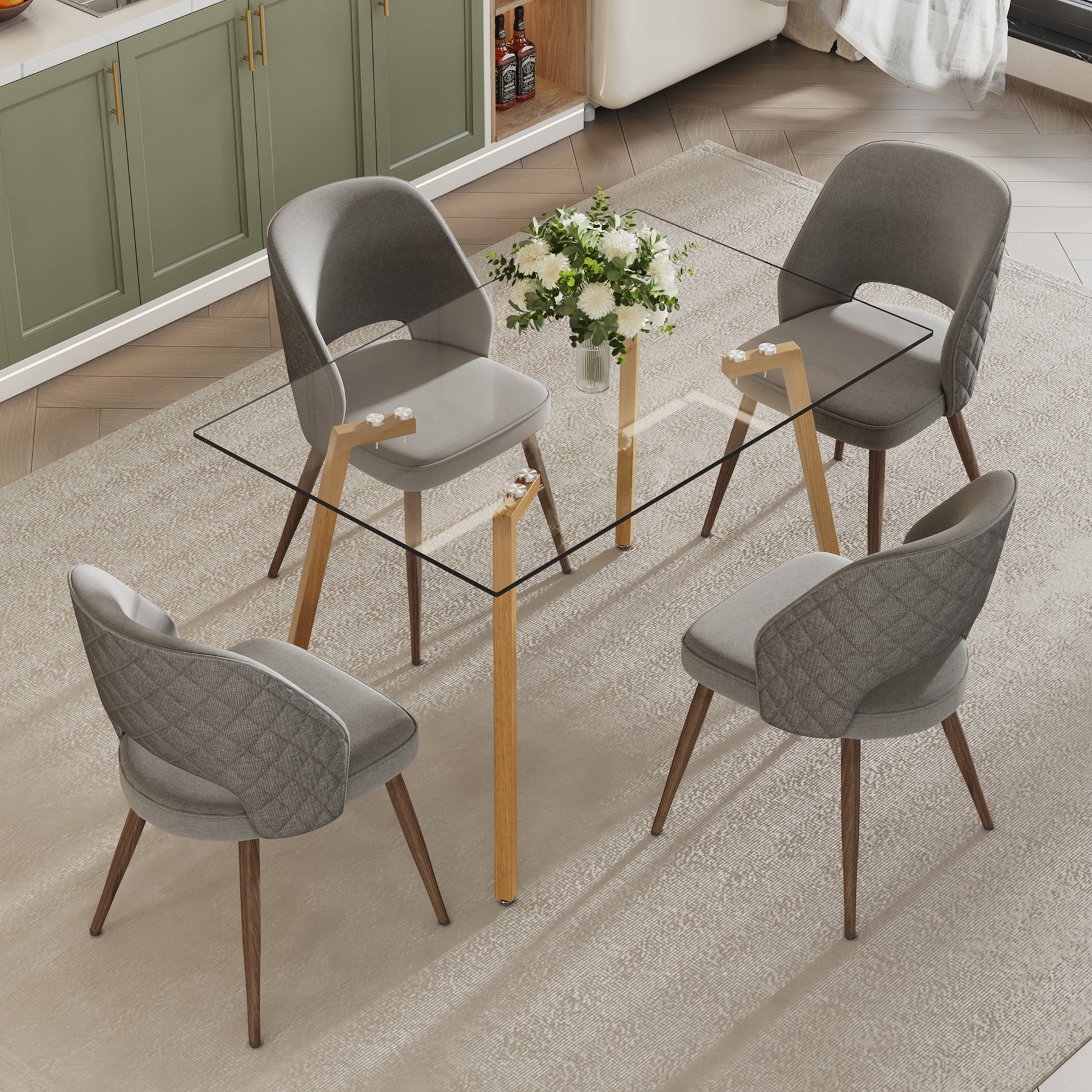 Dining Chair and Table Set- 4 Light Gray Wooden Colored Metal Leg+ 1 Glass Dining Table