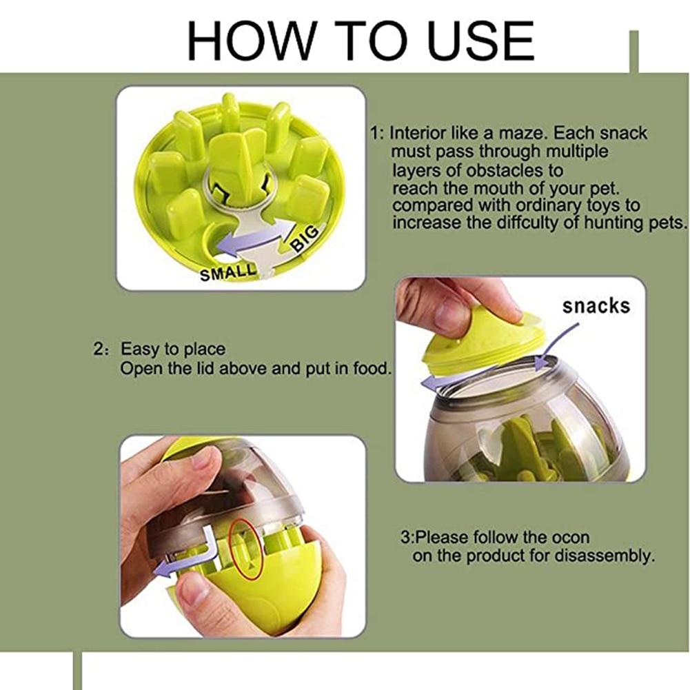 Cats and Dogs Treat Toy TumblerA fun way to give your cats and dogs their favorite snacks. Simply fill the ball, select the difficulty level and let your pets get to work! Durable Tangle Free Retractable Dog Leash with Anti Slip Handle     Color: Green, Pink Material : PlasticSize : 4 " x 4.8"Built-in labyrinth device to expand the food flowing time.Special designed with three air outlets on the top to make your pet easily attract to the food smell and chase the ball.Easy to use: Open the top cover to fill in food. Adjustable barrier design for controlling the speed of food flowing.  Make this toy ball food dispenser a gift for your pet to reduce anxiety and feel less lonely when you are working not at home, giving your pet an ultimate brain teaser with this amazing IQ ball with food dispenser