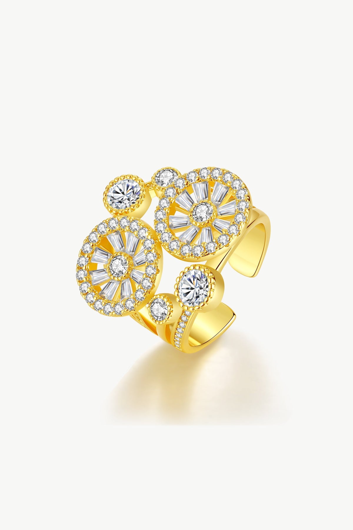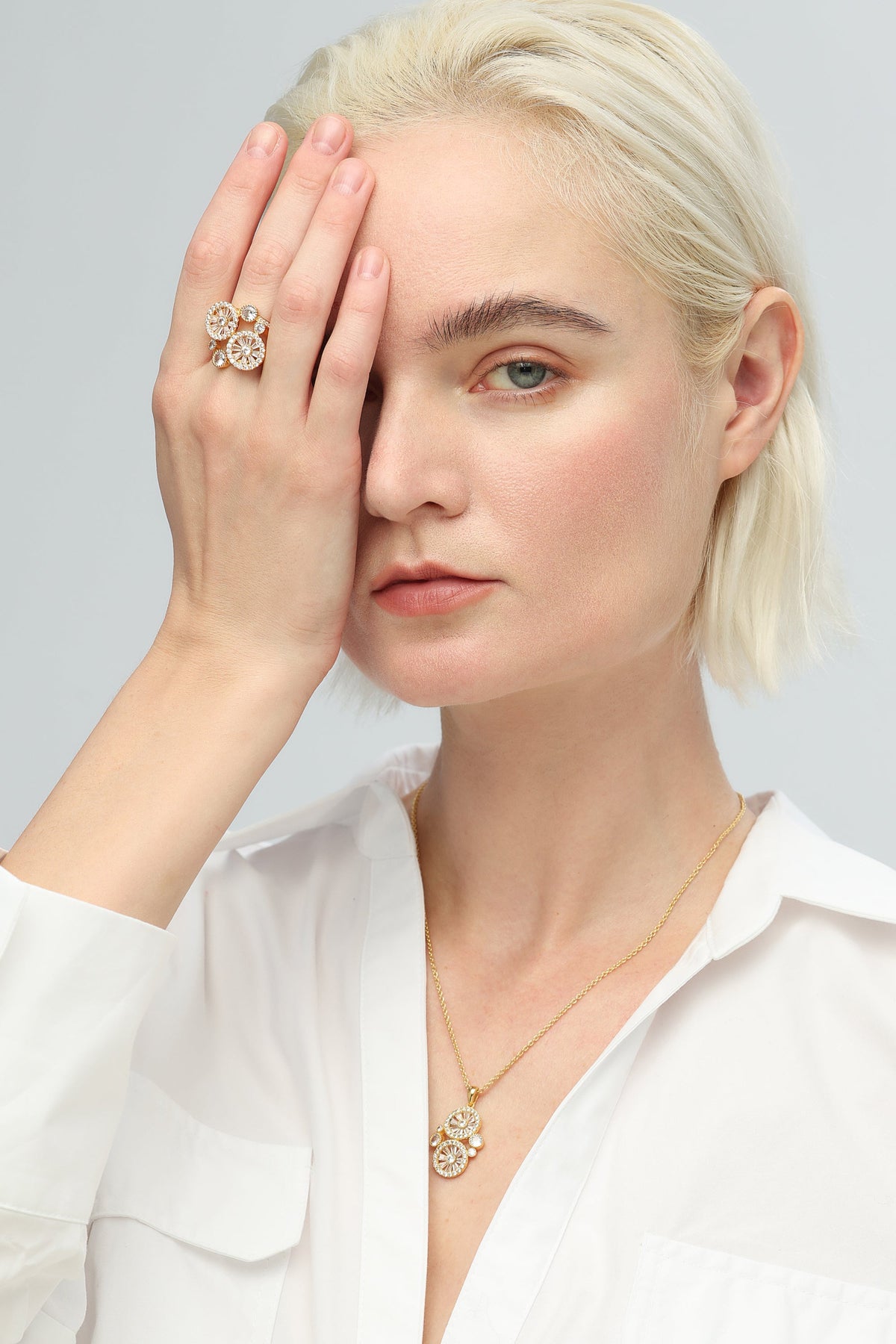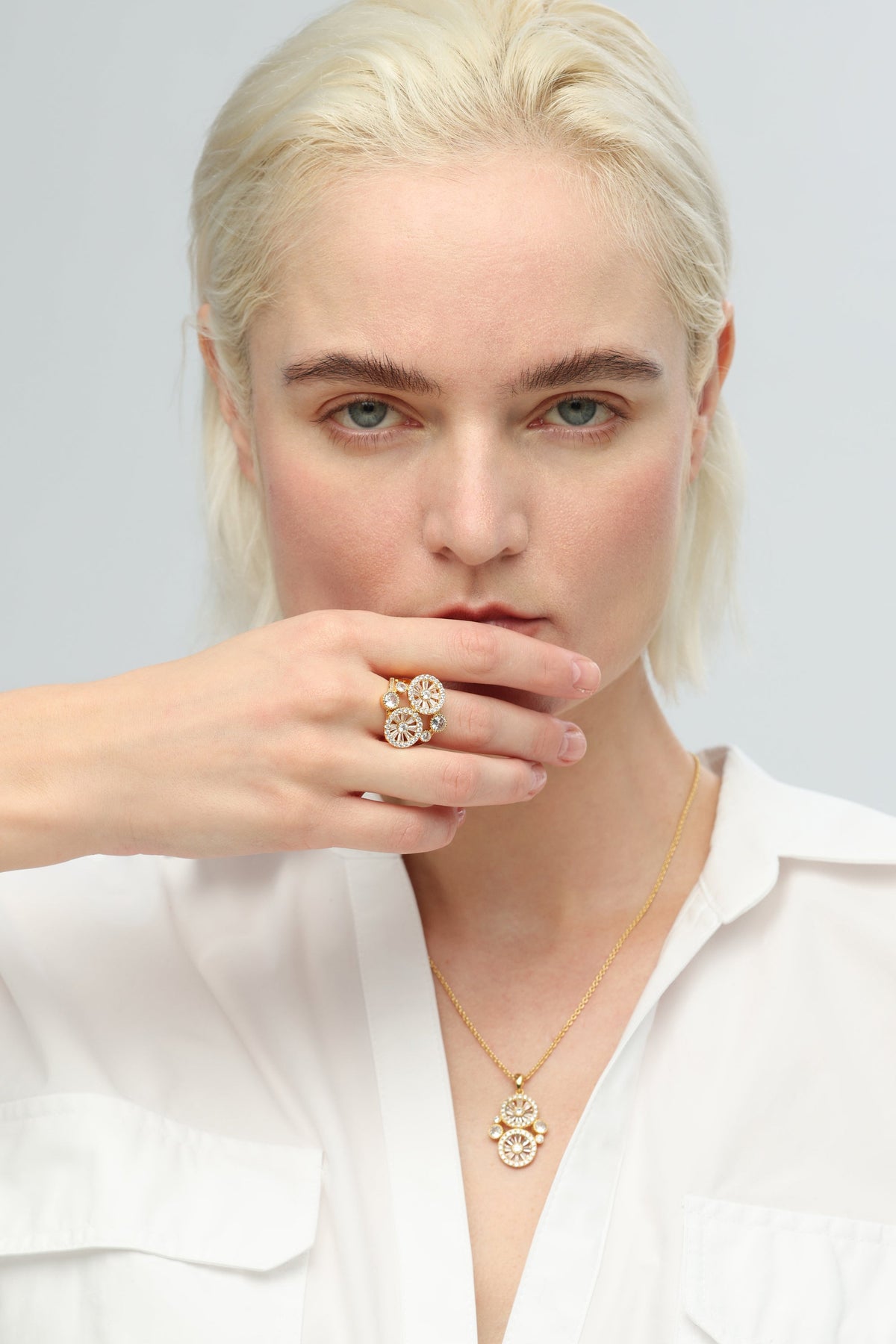 Inspired by the interpretation of “The Wheel of Fortune", this ring is absolutely special and stunning!  It showcases wheel design and sparkling pavé-set cubic zirconia that dazzle in their beauty and cause a stair. The unique design is both refined and playful, and an essential addition to any jewelry box. Pair with the wheel of fortune necklace for a full matching set. Both necklace and finger ring are available in gold and silver. 18k gold plated brass 5A grade cubic zirconia Dimension: 2.2cm x 2.3cm/0.87inch x 0.91inch Ring size adjustable
