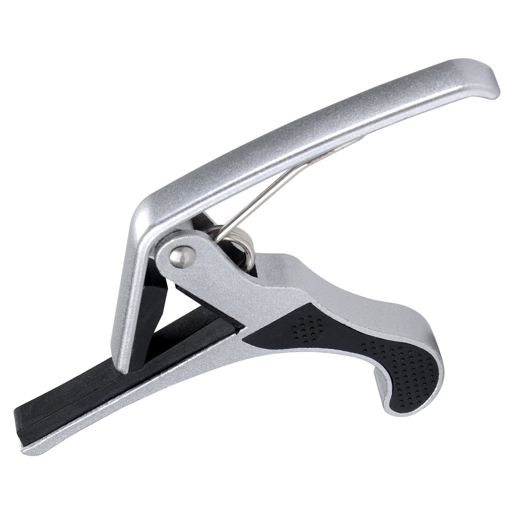 Aluminum alloy silver Guitar Capo with black rubber padding, isolated on a white background.