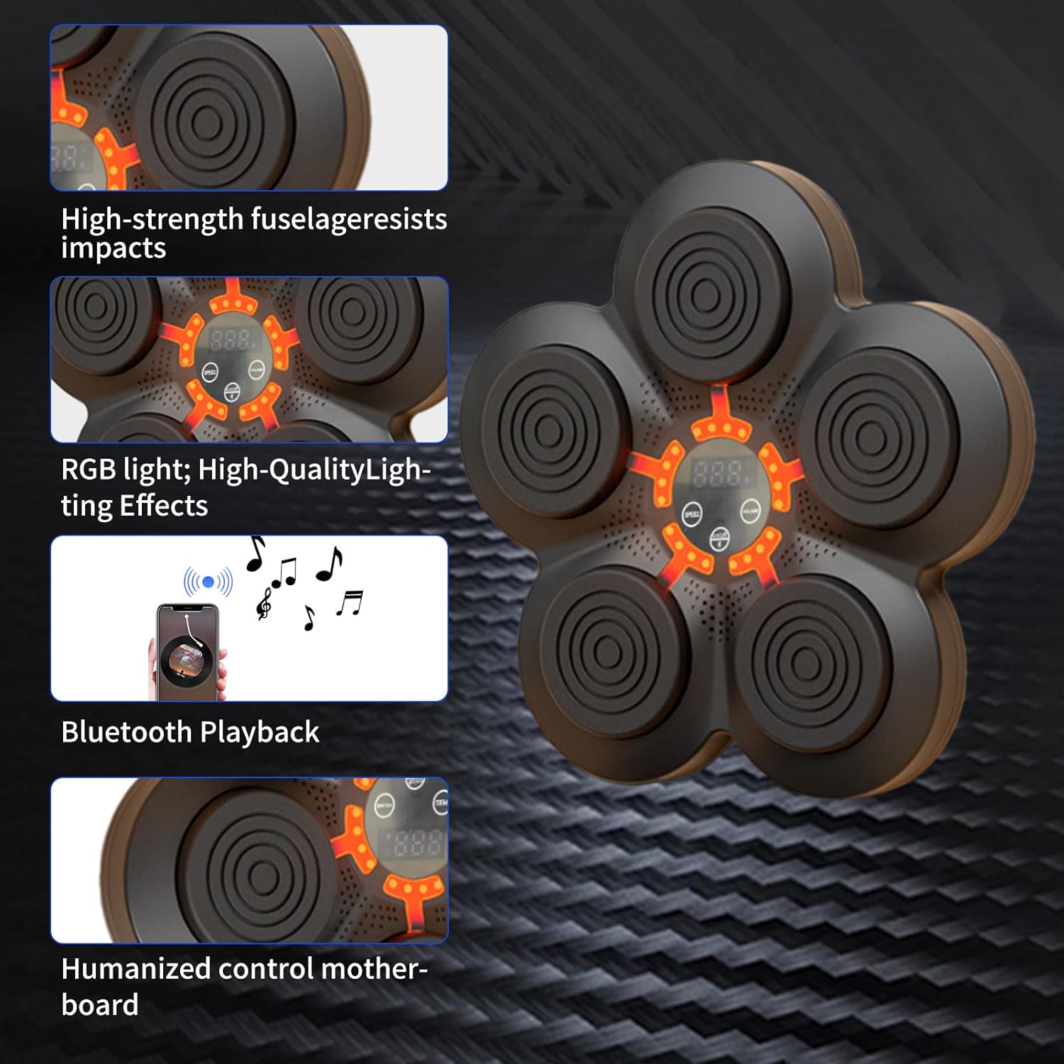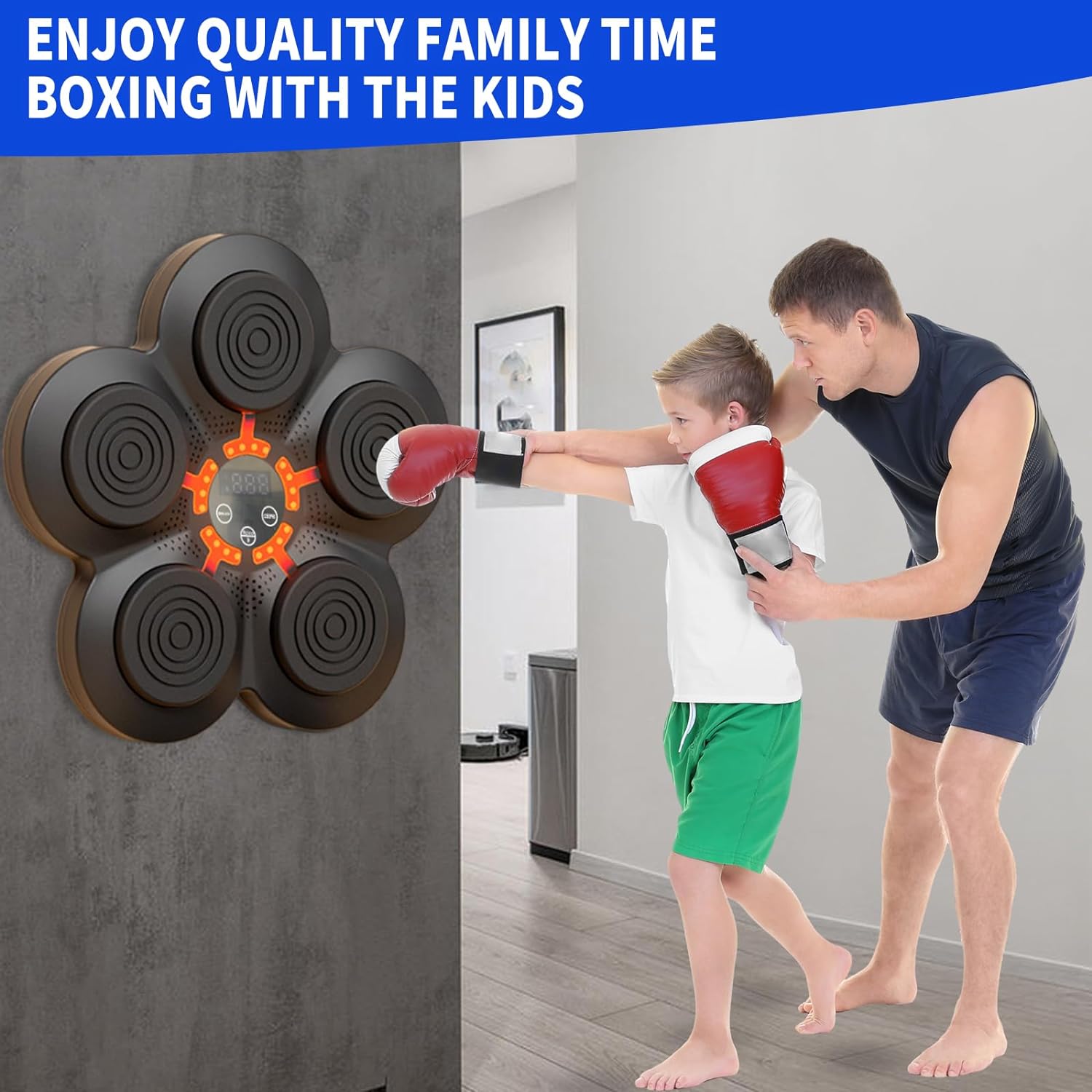 CONNECT TO YOUR MOBILE: Pair your smartphone with the smart boxing machine wall mounted music feature, a versatile music boxing machine, to enjoy your favorite tunes during your boxing workouts. Whether it's your energetic boxing workout playlist or soothing tunes, our wall-mounted music boxing machine allows you to set the mood for an invigorating boxing training session WALL-MOUNTED DESIGN: Our electronic boxing trainer measures 13 inches x 14.5 inches x 1.7 inches - perfect for rooms of all sizes! This music boxing machine wall one punch not only maximizes your living space but also keeps your boxing workout area organized and clutter-free, allowing you to conveniently work out without taking up valuable floor space. DURABLE AND STABLE: Crafted from high-strength materials, our one punch boxing machine is built to last. It can withstand prolonged use, ensuring your safety and durability during your Punching drills. SPEED MODES: The musical boxing machine offers an impressive range of 9 speed modes, allowing novices to progress steadily and experienced boxers to challenge themselves. Whether you're looking to improve your speed, endurance, or lose weight, our music boxing machine has the right setting for you to achieve your boxing conditioning goals SUITABLE FOR CHILDREN AND ADULTS: This music punching machine is cater to all age groups, enabling both children and adults to use it for physical exercise or stress relief. It's a versatile boxing music machine that can be enjoyed by all, making it the perfect addition to your home gym or boxing training setup