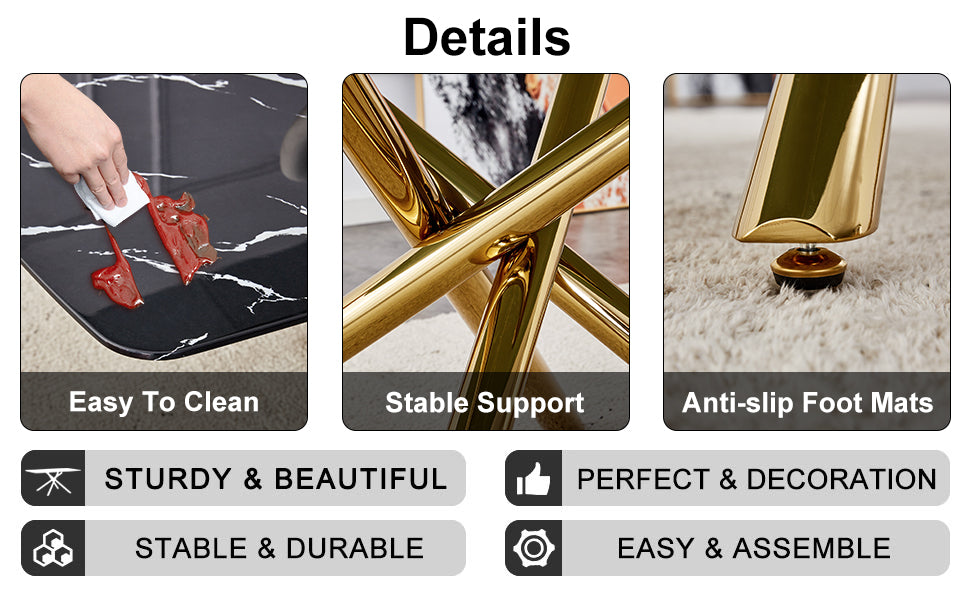 Large modern minimalist rectangular dining table with 0.39 "imitation marble black tabletop and golden metal legs, for Kitchen Dining Living Meeting Room Banquet hall 1537_10