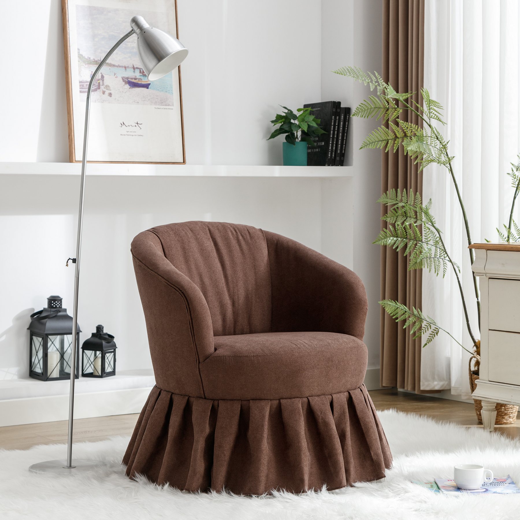Linen Fabric Accent Swivel Chair Auditorium Chair With Pleated Skirt- Brown_1