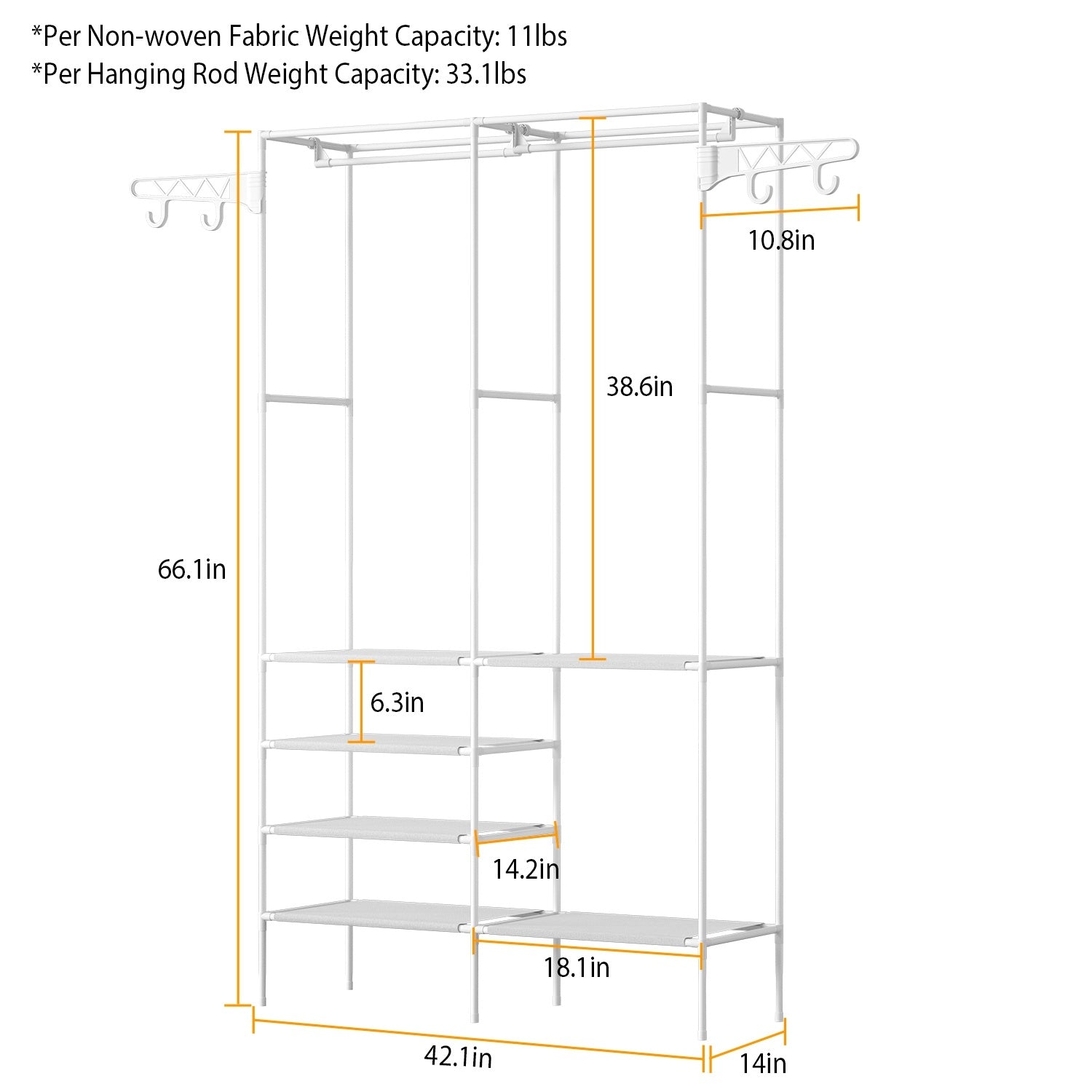 *Perfect Closet Organizing System*:Dimensions:66.1x42.1x14.2in.This garment rack is great for creating storage space to organize your clothes and shoes in your laundry room and bedroom. Two hanging rods can hang coats; long dresses; jacket; and other heavy clothes. 4 layers of shelves add extra space to store beddings; shoes; and boxes. Two side hooks are designed for bags and scarfs. Make your room tidy and organized with this rack.