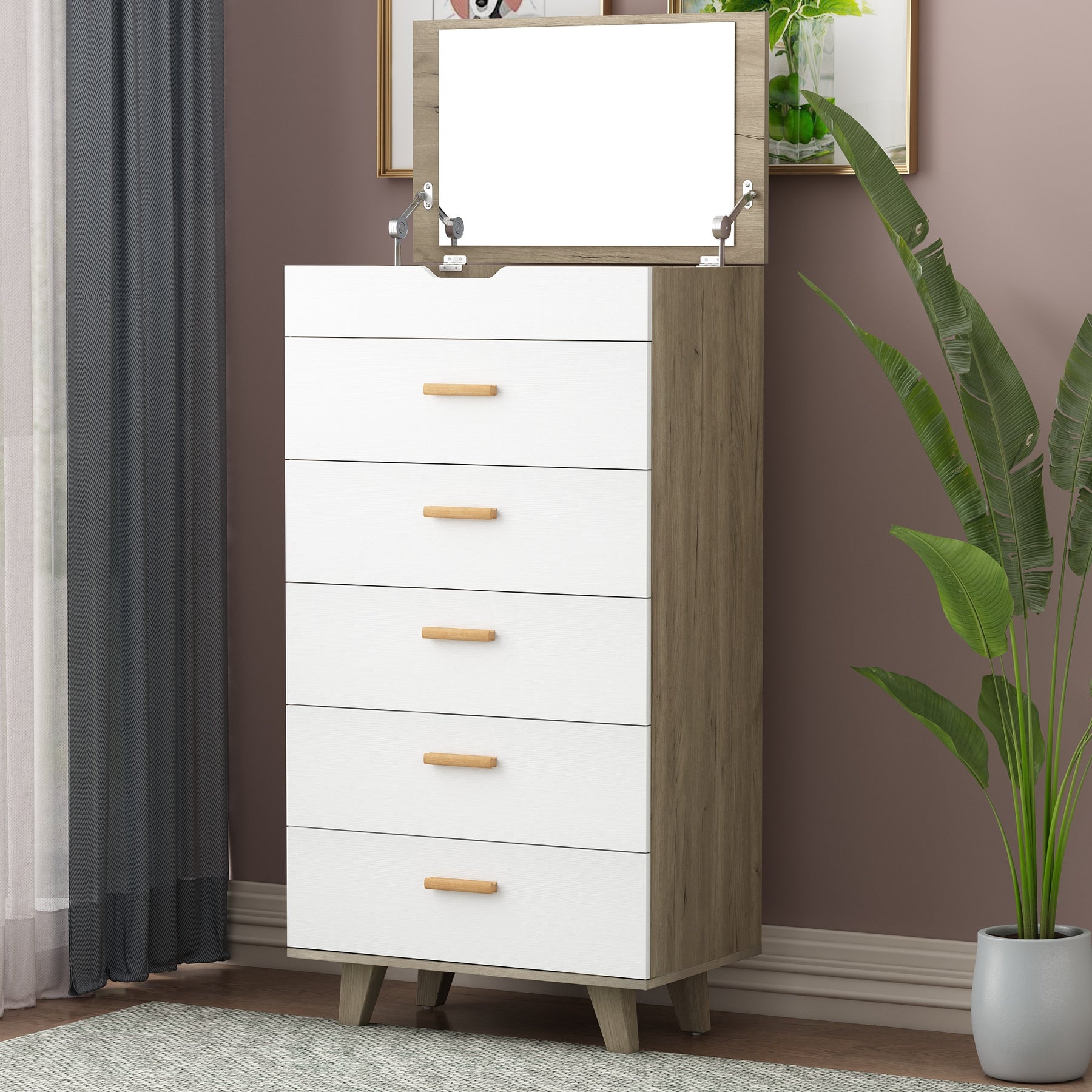 Modern Design Solid Wood Drawer Dresser Cabinet with Makeup Mirror-White Oak_1