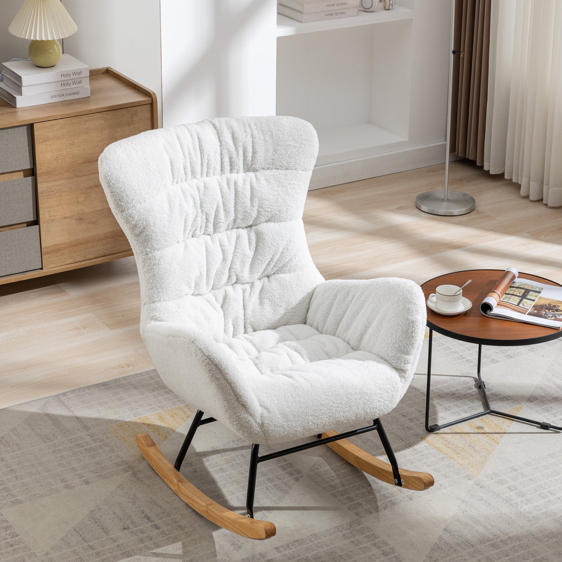 Modern Teddy Fabric Rocking Chair Accent Armchair with Wooden Legs- Ivory_1
