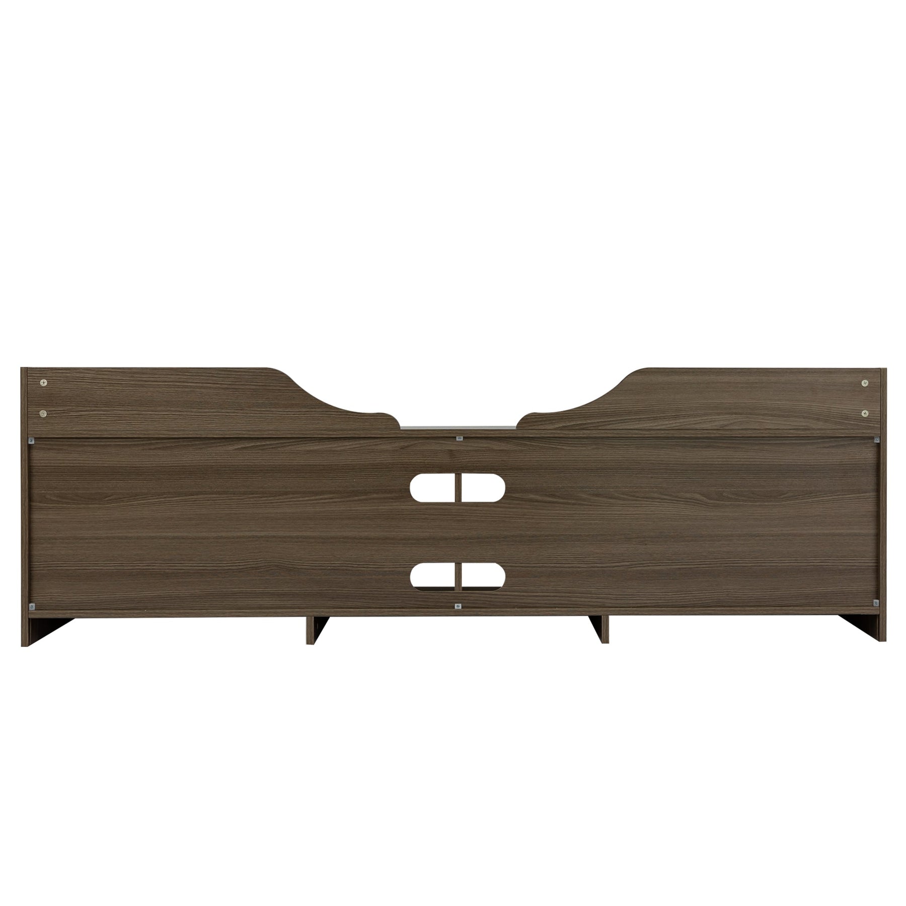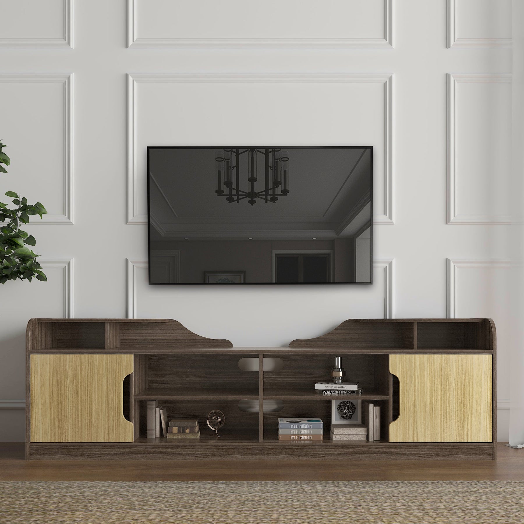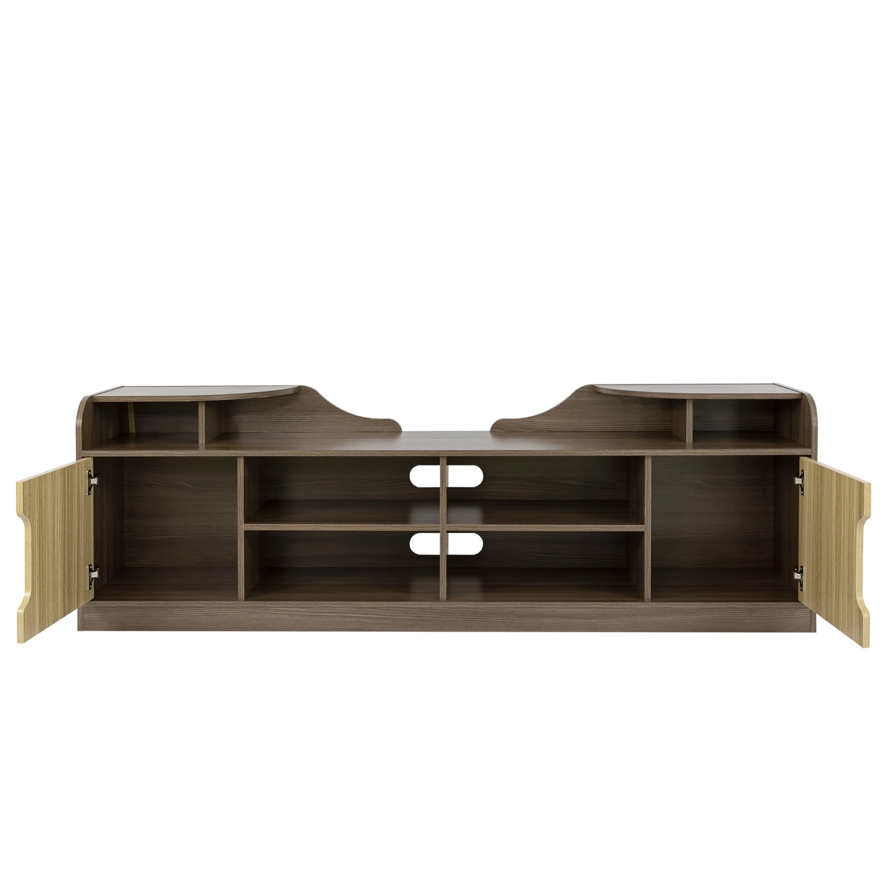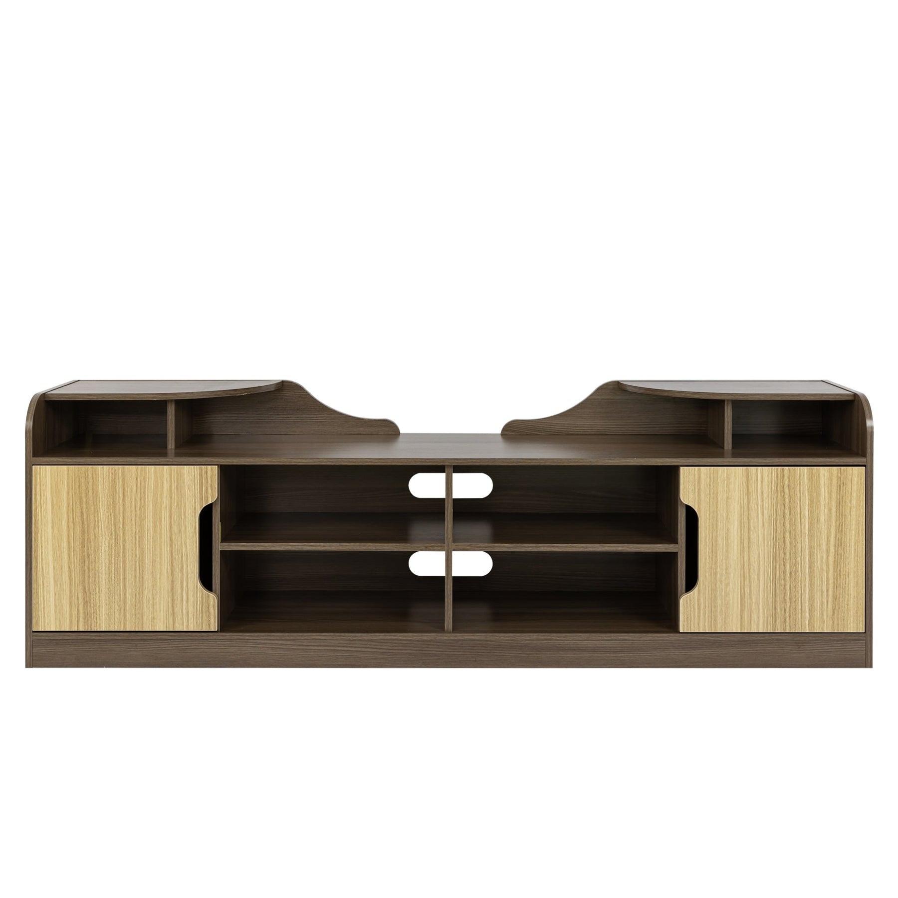 Feature: This media TV console table fit up to 70 inch TV. Spacious tabletop along with storage satisfies all your display and storage needs in the bedroom or living room Product Description: This TV cabinet features a modern, minimalist design that complements any room theme. It can create a different atmosphere for your room and adds a touch of sophistication to your living space. Made of P2 particleboard, TV stand is scratch proof and waterproof, and easy to maintain. The modern and minimalist structure also provides great stability, with up to 110 pounds bearing capacity. The set comes complete with all the accessories needed for assembly. It also comes with easy-to-understand instructions that you can follow. It only takes 10-15 minutes to set up and install.  Product Specification: Color: Beige+Brown Material: Particle Board Size: 70.87 x 15.16 x 22.83 inches Function: Home Furniture Package Inclusion: 1 x TV Stand 1 x Assembly Kit