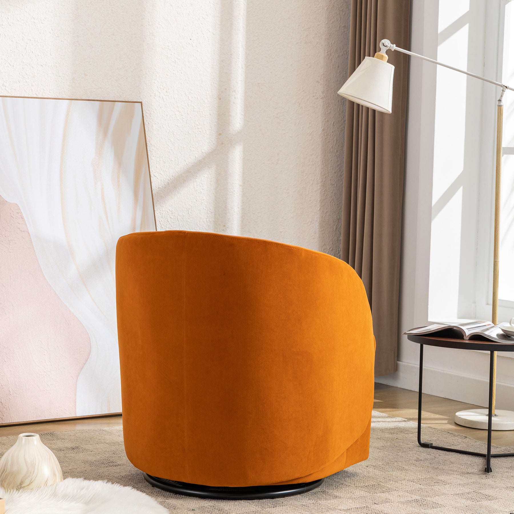 Modern Upholstered Velvet Fabric Curved Back Swivel Chair Accent Barrel Chair- Orange_8
