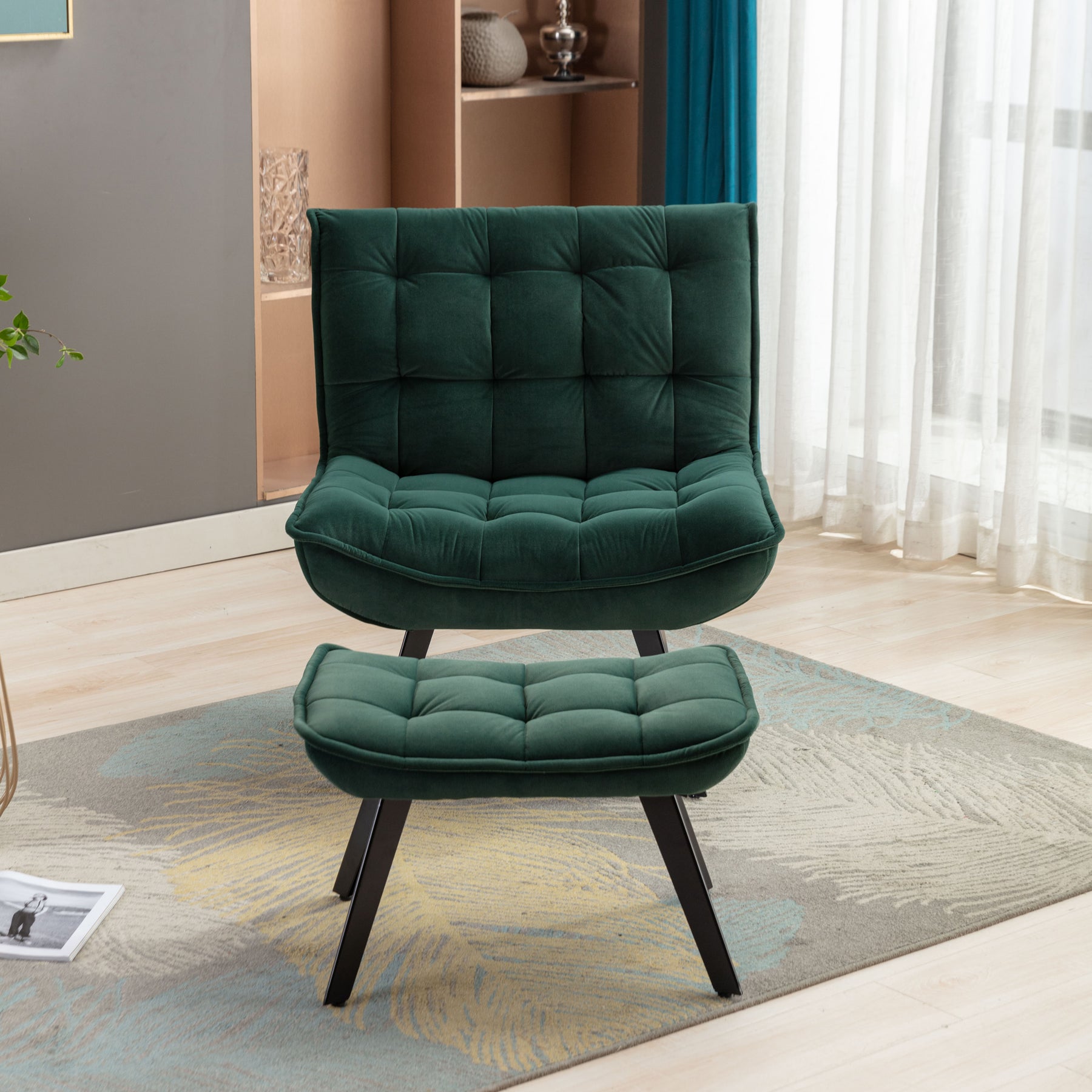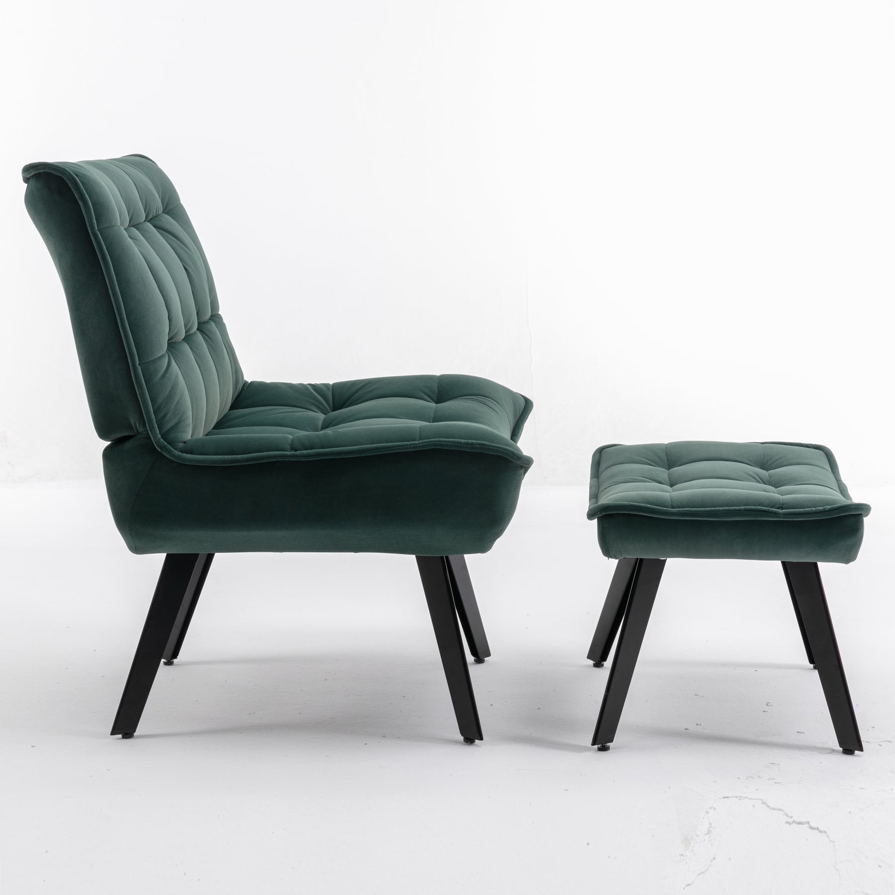 Modern Velvet Fabric Ottoman Lounge Chair with Metal Legs & Footrest Set- Dark Green