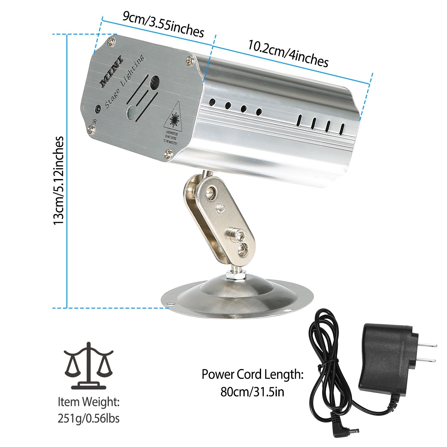 Sound Activated LED Projector Laser Patterns Laser Party Lights Disco Bar Music Strobe Lights on a pivoting mount with remote control, isolated on a white background.