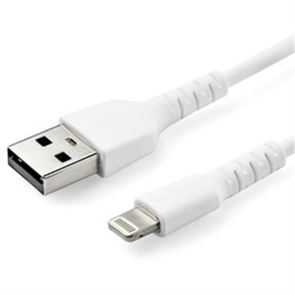 Kevlar aramid fiber shelters heavy duty lightning cable from stress of bends/twists - White durable strong rugged USB-A to Lightning charger cable - Strain relief for 10000 bend cycles - Apple MFi certified charging cord for iPhone - USB 2.0 480 Mbps General Information Manufacturer: StarTech.com Manufacturer Part Number: RUSBLTMM1M Brand Name: StarTech.com Product Name: 3.3 ft. (1 m) USB to Lightning Cable - Apple MFi Certified - White Marketing Information: This USB to Lightning cable withstands the daily demands of charging and syncing your mobile devices. Tested to endure strenuous wear and tear and winter and summer in-car use, the rugged cable is a must-have for both business and consumer applications.Built for Daily Use The durable Lightning cable has aramid fiber reinforcement that shelters it from the stress of frequent bends and twists. This also lets the cable flex without over-stretching, and strengthens the core of the cable. Cable Key Features Aramid fiber adds strength and durability to the cable Insulated conductors reduce friction, provide more flexibility EMI (electromagnetic interference) protection with aluminum-mylar foil with braided shielding TPE (thermoplastic elastomer) cable jacket is softer and more flexible than a standard PVC cable and environmentally friendly Flexible Strain Relief The cable is constructed to prevent the connector from separating from the jacket. The extra-long strain relief molding is tested to withstand over 10,000+ bend cycles at a 180 angle. Plus, the improved inner molding resists cracking and reduces cable damage. Connector Key Features Lightning connector provides 12W for charging your iOS devices Metal shield protects circuit board from EMI and reinforces the connection point Strain relief tested to tolerate over 10,000+ bend cycles at a 180 angle Comprehensive Product Testing & Expert Technical Support StarTech.com conducts thorough compatibility and performance testing on all our products to ensure we are meeting or exceeding industry standards and providing high-quality products to our customers. Our local StarTech.com Technical Advisors have a broad product expertise and work directly with StarTech.com Engineers to provide support for our customers both pre and post-sales. RUSBLTMM1M is an Apple MFi certified Lightning cable backed by a StarTech.com 2-year warranty. Note: DuPont and Kevlar are trademarks or registered trademarks of E.I. du Pont de Nemours and Company. Packaged Quantity: 1 Product Type: Data Transfer Cable Technical Information Cable Type: Lightning/USB Cable Length: 3.28 ft Connector Type on First End: USB 2.0 Type A - Male Connector on First End Details: 1 x 4-pin USB 2.0 Type A - Male Connector Type on Second End: Lightning - Male Connector on Second End Details: 1 x 8-pin Lightning - Male Connector Plating: Nickel Features: 180 Angled Connector Features: Bend Resistant Features: Charging Features: Crack Resistant Features: Damage Resistant Features: EMI Protection Features: Flexible Features: Heavy Duty Features: Molded Features: Rugged Features: Strain Relief Features: Stress Resistant Features: Stretch Resistant Features: Tear Resistant Features: Twist Resistant Features: Wear Resistant Shielding: Yes Device Supported: AirPods Device Supported: Charger Device Supported: iPad Device Supported: iPad Air Device Supported: iPad mini Device Supported: iPhone Device Supported: Magic Keyboard Device Supported: Magic Mouse Device Supported: Magic Trackpad Device Supported: Siri Remote Device Supported: Smartphone MFI: Yes American Wire Gauge: 22/32 AWG Data Transfer Rate: 480 Mbit/s Physical Characteristics Product Color: White Jacket Material: Thermoplastic Elastomer (TPE) Weight (Approximate): 0.06 lb Miscellaneous Compatibility: Apple: iPhone 11 Pro iPhone 11 iPhone XR iPhone 8 Environmentally Friendly: Yes Environmental Certification: WEEE Country of Origin: China Warranty Limited Warranty: 2 Year