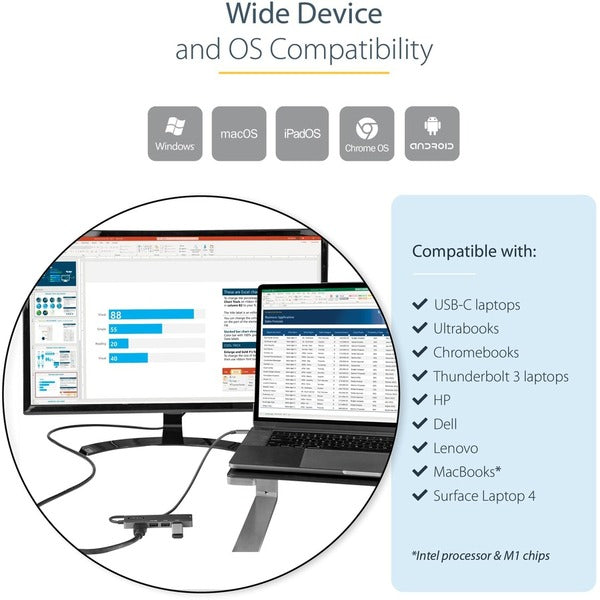 USB-C multiport adapter 4K 60Hz HDMI 2.0b (DP 1.4 Alt-Mode) - USB 3.0 Hub 5Gbps (2x USB-A/1x USB-C) - USB C Mini Dock with 100W Power Delivery Passthrough - 12in long cable - USB Type-C laptop power adapter or bus power -Win/mac/Chrome/iPadOS/Android General Information Manufacturer: StarTech.com Manufacturer Part Number: DKT30CHPD3 Brand Name: StarTech.com Product Name: Docking Station Marketing Information: This USB-C multiport adapter with DP 1.4 supports 4K 60Hz HDMI and turns your MacBook Pro, Dell XPS, or other USB-C laptops or tablet into a workstation, anywhere you go. The USB Type-C multiport adapter provides 4K HDMI video output, three USB 3.2 Gen 1 Type-A (5Gbps) ports including one BC 1.2 charge port; one USB-C port supporting both the 100W PD passthrough, all through one connection to your laptop's USB-C or Thunderbolt 3 port. Plus, it offers advanced charging through USB Power Delivery 3.0 and an extra-long attached 12-inch (30 cm) host cable for an extended reach to offer more set up flexibility. Enhance Productivity The portable docking station connects your laptop to a 4K 60Hz HDMI monitor (4096 x 2160p) to create a powerful workstation. It can also connect to an ultrawide monitor. DP Alt Mode Required Maximum Resolution DP 1.2 Alternate Mode Up to 4K 30Hz DP 1.4 Alternate Mode Up to 4K 60Hz Connect Your Devices The USB-C to USB 3.1 Gen 1 hub gives you three USB-A ports to connect your legacy USB devices, plus one shared USB-C port for either power delivery pass through. Charge Your Laptop and Peripherals With support for USB PD 3.0 (up to 100W), the USB Type-C multiport adapter lets you power and charge your laptop, and power your peripherals when connected to a USB-C power adapter. PD 3.0 features Fast Role Swap to prevent USB data disruption when you switch power sources (USB-C power adapter to bus power). The DKT30CHPD3 is backed by a StarTech.com 3-year warranty and free lifetime technical support. Note: To ensure full adapter functionality, your laptop's USB-C port must support USB Power Delivery. Packaged Quantity: 1 Product Type: Docking Station Technical Information Connectivity Technology: Wired Device Supported: Notebook/Tablet/Workstation/Monitor Number of Displays Supported: 1 Screen Mode Supported: 4K Supported Resolutions: 3840 x 2160 Interfaces/Ports Host Interface: USB Type C Number of USB Type-A Ports: 3 Number of USB Type-C Ports: 1 USB Type-A: Yes USB Type-C: Yes USB Type-C Detail: 1 x USB-C (100W PD Passthrough) Network (RJ-45): Yes Number of HDMI Ports: 1 HDMI: Yes Thunderbolt: Yes Software Operating System Supported: Android Operating System Supported: Chrome OS Operating System Supported: iPadOS Operating System Supported: macOS Operating System Supported: Windows Power Description Maximum Power Supply Wattage: 100 W Physical Characteristics Height: 0.50" Width: 11.80" Weight (Approximate): 3.30 oz Miscellaneous Package Contents: Docking Station Product Insert Compatibility: Compatibile Products: Microsoft Surface Laptop 4 Microsoft Surface Pro 7 Apple iPad Pro HP Elite x2 Google Chromebook Brand Compatibility: Apple Brand Compatibility: Dell Brand Compatibility: Google Brand Compatibility: HP Brand Compatibility: Lenovo Brand Compatibility: Microsoft Country of Origin: Vietnam Warranty Limited Warranty: 3 Year
