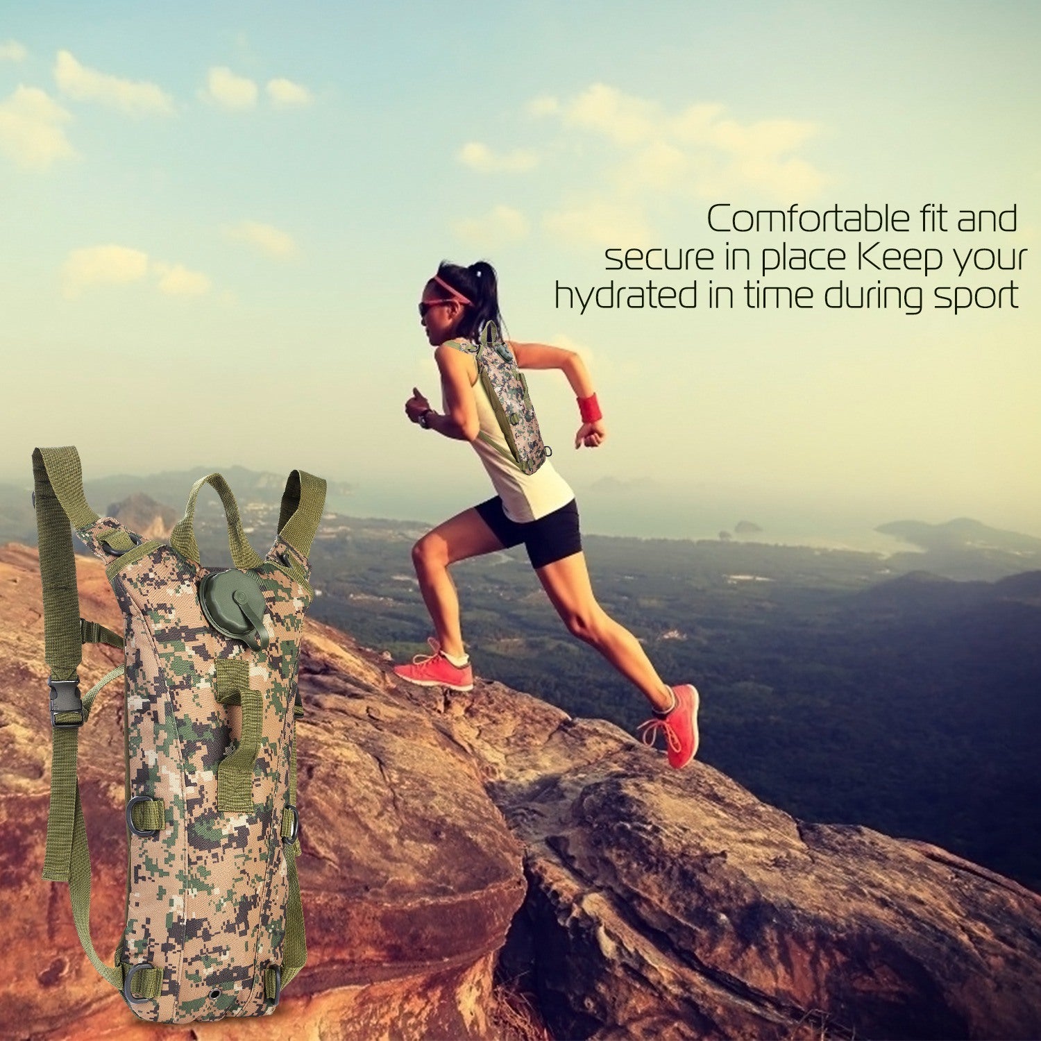 Tactical Hydration Pack suitable for running, cycling, and climbing. Includes water bladder, camo backpack, and icons indicating BPA-free material.