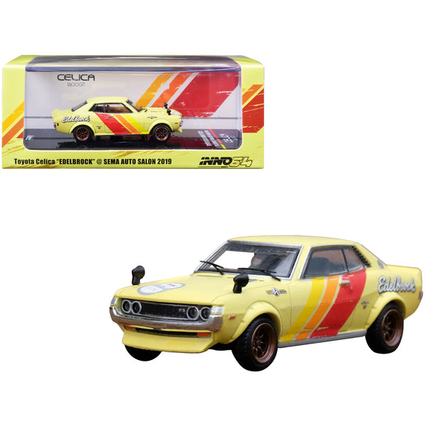 Brand new 1/64 scale diecast car model of Toyota Celica 1600GT (TA22) Yellow with Stripes (Weathered) "Edelbrock" SEMA Auto Salon (2019) die cast model car by Inno Models. Brand new box. Detailed exterior. Real rubber tires. True-to-scale detail. Officially licensed product. Does not have any openings. Comes in a plastic display showcase. Manufacturer's original unopened packaging. Dimensions approximately L-2.5 inches long. Made of diecast metal with some plastic parts.