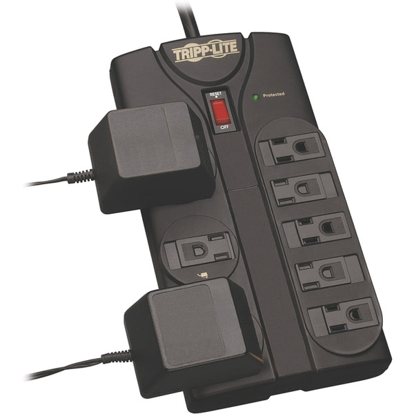 8 x NEMA 5-15R - 1800 VA - 1440 J - 120 V AC Input General Information Manufacturer: Tripp Lite by Eaton Manufacturer Part Number: TLP808B Brand Name: Tripp Lite Product Line: Protect It! Product Model: TLP808B Product Name: Protect It! 8-Outlet Surge Protector, 8 ft. Cord, 1440 Joules, Black Housing Marketing Information: Perfect for your home or office workstation, the TLP808B Protect It! 8-Outlet Home-Computer Surge Protector features a surge suppression rating of 1440 joules to defend your sensitive electronic components against strong surges and spikes. In fact, Tripp Lite will repair or replace any connected equipment damaged by surges, including direct lightning strikes, up to $75,000 for life (valid in the U.S., Canada and Puerto Rico only).The TLP808B includes full normal mode (H-N) and common mode (N-G/H-G) line surge suppression, as well as technology that filters out disruptive EMI/RFI line noise, preventing interference from disrupting your electronics and inflicting damage or data loss.Your computer and peripherals plug into eight NEMA 5-15R outlets, including three widely spaced outlets designed to accept bulky transformers without blocking adjacent outlets. Built-in child-safety covers block accidental contact with unused outlets. Integrated 15-amp circuit breaker protects all outlets against dangerous overloads. Lighted on/off switch provides one-touch control over connected equipment. LEDs indicate protection status and that your wall outlet is properly grounded.The eight-foot AC power cord allows the TLP808B to reach distant outlets, while its right-angle NEMA 5-15P plug allows furniture and equipment to be moved flush against the wall to save space in your workstation. Keyhole slots on the bottom panel provide convenient wall or desk mounting options. Product Type: Surge Suppressor/Protector Technical Information Receptacles: 8 x NEMA 5-15R Power Description Input Voltage: 120 V AC Power Handling: 1800 VA Surge Energy Rating: 1440 J Physical Characteristics Product Color: Black Power Cord/Cable Length: 8 ft Height: 4.9" Width: 9.6" Depth: 1.5" Weight (Approximate): 1.76 lb Shipping Height: 2" Shipping Width: 7.50" Shipping Depth: 11.50" Shipping Weight (Approximate): 2 lb Miscellaneous Package Contents: Protect It! 8-Outlet Surge Protector, 8 ft. Cord, 1440 Joules, Black Housing Owner's Manual Environmentally Friendly: Yes Environmental Certification: RoHS Country of Origin: China Warranty Limited Warranty: Lifetime