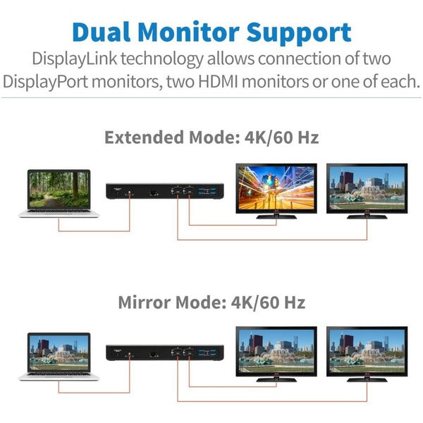 for Notebook/Tablet/Smartphone - 85 W - USB Type C - 6 x USB Ports - 4 x USB 3.0 - Network (RJ-45) - HDMI - DisplayPort - Thunderbolt - Wired General Information Manufacturer: Tripp Lite by Eaton Manufacturer Part Number: U442-DOCK21-B Brand Name: Tripp Lite Product Model: U442-DOCK21-B Product Name: U442-DOCK21-B Docking Station Marketing Information: SB-C Docking Station Turns Your Device's USB or Thunderbolt 3 Port into 14 New Ports This universal USB-C dock with PD Charging expands the potential of your Windows laptop, Chromebook, smartphone or PC's USB-A, USB-C or Thunderbolt 3 port. Connect the docking station using the included USB-C cable, and add 14 ports to your device: (2) 4K HDMI (2) 4K DisplayPort RJ45 Gigabit Ethernet (4) USB 3.0 USB 3.0 with BC 1.2 USB-C PD Charging USB-C data (2) 3.5 mm stereo Transmits Crystal-Clear True 5K/4K Video and Digital Audio with 4:4:4 Color The HDMI and DisplayPort (DP) outputs support true 4K resolutions up to 4096 x 2160 at 60 Hz with 4:4:4 chroma subsampling for top-level PC gaming or using your HDTV as a PC monitor. When both DP outputs are connected to one DP monitor, that monitor will support 5K video up to 5120 x 2880 at 60 Hz. DisplayLink Technology Allows Connection of Multiple Displays By downloading and installing the proper DisplayLink drivers to your host device, you may connect two external displays simultaneously. This allows you to display the image from the host computer on both monitors, extend your host desktop across both with different windows open on each, or combine all into one large display as a video wall. Connect multiple monitors (dual 4K @ 60 Hz DP; dual 4K @ 60 Hz HDMI; or 4K @ 60 Hz DP and 4K @ 60 Hz HDMI) in Extended and Mirror modes. Note: Mac OS laptops or computers will only extend to one monitor. The others will be mirrored. USB Hub Ports Connect Keyboards, Thumb Drives and Other Peripherals One USB-C and five USB-A ports accept USB peripherals, such as flash drives, mice, keyboards and printers. All support fast USB 3.2 Gen 1 data transfer rates up to 5 Gbps and are backward compatible with USB 2.0 and USB 1.1 devices. One USB-A port also supports BC 1.2 charging with 5V 1.5A (7.5W) of power dedicated to fast-charging your mobile device. PD Charging Port Charges the Connected Notebook, Tablet or Other Device Connect your host device to the USB-C Power Delivery port, which supports PD 2.0 charging of connected PD Charging-compliant devices, such as laptops, Kindles, iPads and Android smartphones, up to 20V 4.25A (85W). The included power supply, when plugged into an AC outlet, provides the charging power. Accesses a Wired Gigabit Ethernet Network The RJ45 port offers access to a Gigabit Ethernet network when Wi-Fi is unavailable or when a wired connection offers faster speeds. Connect using a UTP cable (sold separately), and enjoy true 10/100/1000 Mbps Ethernet speeds for fast data transfers. Connects Speakers, Microphone and Other Audio Equipment Two 3.5 mm mini stereo jacks are convenient for connecting speakers, headphones and/or a microphone to your workstation. You can listen to music or record the latest episode of your podcast. Anti-Theft Lock Protects the Docking Station When You Aren't Around Connect a user-supplied computer/laptop security cable lock (not included) to this K-lock port to protect your source device against theft. Detachable USB-C Cable Connects in Either Direction Unlike traditional USB cables that connect in only one direction, the reversible USB-C male connector plugs into a USB-C or Thunderbolt 3 port in either direction for an instant connection every time. A USB-C to USB-A adapter is included for connecting the docking station to your host device's USB-A port. Product Type: Docking Station Technical Information Connectivity Technology: Wired Device Supported: Notebook/Tablet/Smartphone Interfaces/Ports Host Interface: USB Type C Total Number of USB Ports: 6 Number of USB 3.0 Ports: 4 USB Type-C: Yes USB Type-C Detail: the reversible USB-C male connector plugs into a USB-C or Thunderbolt 3 port in either direction for an instant connection every time Network (RJ-45): Yes Number of DisplayPort Outputs: 2 DisplayPort: Yes Headphone/Microphone Combo Port: Yes Number of HDMI Outputs: 2 HDMI: Yes Thunderbolt: Yes Power Description Maximum Power Supply Wattage: 85 W Physical Characteristics Height: 9.84" Width: 3.24" Depth: 1.36" Weight (Approximate): 13.76 oz Miscellaneous Package Contents: U442-DOCK21-B Docking Station USB-C Cable, 1 m USB-C to USB-A Adapter External Power Supply with 5 ft. Cord and NEMA 5-15P Plug (Input: 100-240V, 50/60 Hz, 1.8A; Output: 20V 6.75A) Owner's Manual Environmentally Friendly: Yes Environmental Certification: REACH Environmental Certification: RoHS Country of Origin: China Warranty Limited Warranty: 3 Year