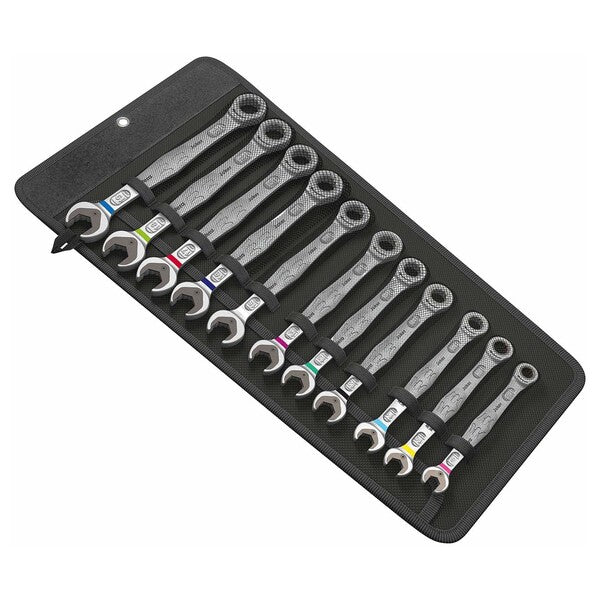 Wera Joker Metric Ratcheting Combination Wrench Set (11-Piece Set) High quality combination ratchet wrench set by Wera: everything that a wrench has to be able to do. And a whole lot more. Faster, better, stylish. Yes, a real Joker. The new generation of combination ratchet wrenches. 11-piece set in a robust pouch. Suitable for hexagon bolt heads or nuts. Comes with a holding function, thanks to the metal plate in the jaw, which reduces the risk of dropping nuts and bolts. The replaceable metal plate in the jaw secures nuts and bolts with its extra hard teeth and limits the danger of slipping. The integrated limit stop prevents any slipping down around the bolt head and allows higher torque to be applied. The double-hex geometry makes for a positive connection with nuts or bolts and reduces the risk of slipping. A return angle of only 30° at the open end prevents any time consuming flipping of the wrench during fastening jobs. The ratchet mechanism at the ring end, with an exceptional, fine-tooth mechanism 80 teeth in all enables flexibility even in very confined working spaces. The specially forged geometry provides for high torque transfer and strength. Manufactured out of high performance chrome molybdenum steel with a nickel-chrome coating for high corrosion protection. &quote;Take it easy&quote; Tool Finder with color coding according to sizes. Metric: 8mm, 10mm, 11mm, 12mm, 13mm, 14mm, 15mm, 16mm, 17mm, 18mm, 19mm Includes a Joker mesh and canvas pouch