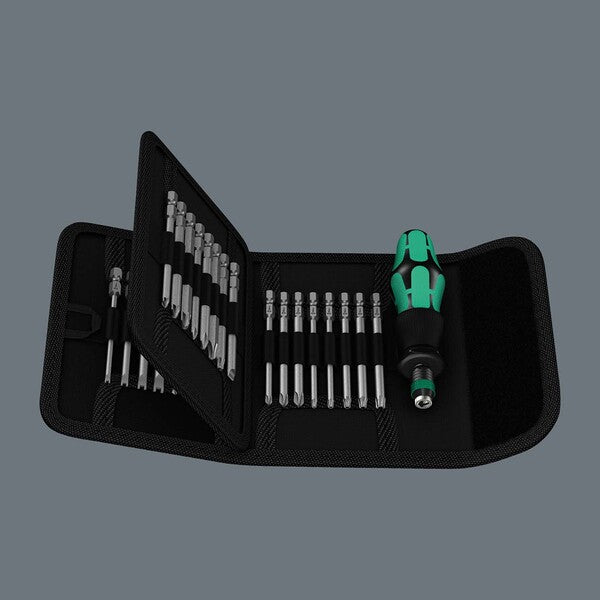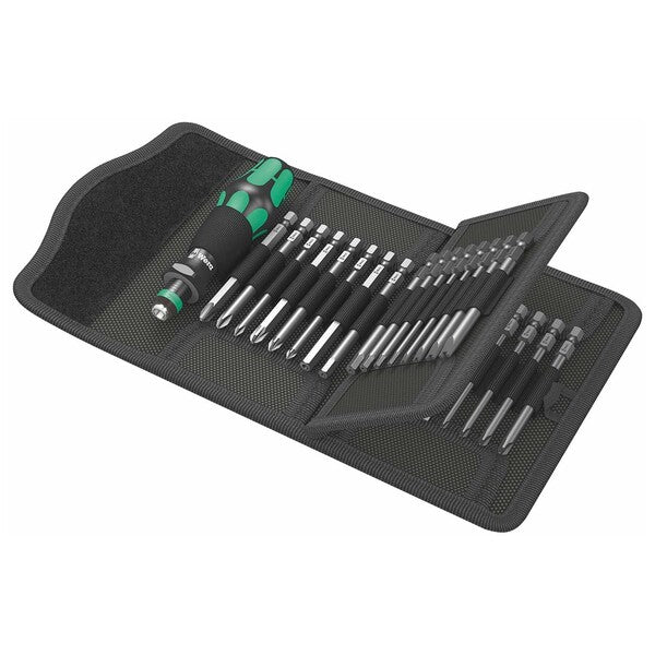 Wera Kraftform Bitholding Screwdriver Set with Pouch (33-Piece Set) Pouch with 89-mm long bits. Includes 816 R Kraftform holder with Rapidaptor quick-release chuck and multi-component Kraftform handle for low-fatigue working. Suitable for manual and power tool operations; 33-piece.