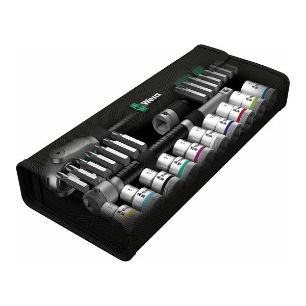 Wera 8100 SC 6 ZYKLOP Metric 1/2 Drive Speed Ratchet Set (29-Piece Set) Incredibly compact set arrangement with many tools in a minimum of space. A completely new ratchet set feeling thanks to the unique textile boxes that are very robust and durable. They can be positioned upright for tidy storage on the workshop shelf. Additional surface protection due to textile outer material. Low weight and volume for simpler mobility. &quote;Take it easy&quote; Tool Finder with colour coding according to sizes. Fine-Tooth Ratchet Design - Small Return Angle of 5° Freely Pivoting Ratchet Head, Push-Button Release & Left/Right Switchover Stored in a Robust Folding Textile Box With &quote;Take it Easy&quote; Tool Finder: Color Coding by Size 6-in-1 1/2&quote; Ratchet Sockets: 10mm 11mm 12mm 13mm 14mm 15mm 16mm 17mm 18mm 19mm 1/2&quote; wobble extension 10&quote; extension with free-turning sleeve, 1/2&quote; bit adapter, 1/2&quote; Bits: TX20 TX25 TX30 TX40 TX45 TX50 PH2 PH3 PZ2 PZ3 HexPlus 5mm HexPlus 6mm HexPlus 8mm HexPlus 10mm