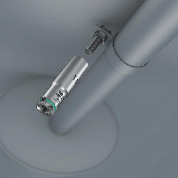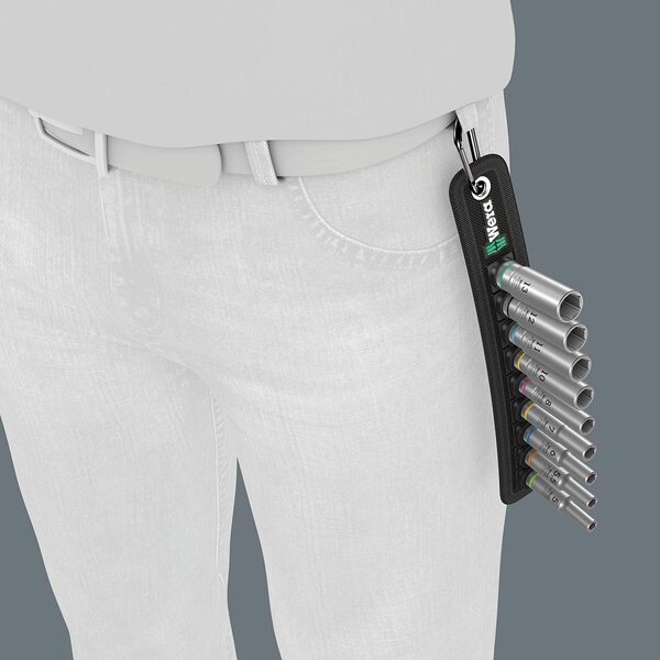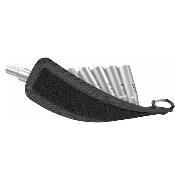 Wera Metric 1/4&quote; Drive Deep Socket Set (9 Piece Set) 9-piece 1/4&quote; Deep Socket set on a robust textile belt Smooth Twist to Unlock mechanism for a secure fit and simple removal of the sockets Long 1/4&quote; socket for low-profile-fitting screw connections in tight construction spaces and for protruding threaded rods Hexagonal profile enables precise and profile-preserving screwdriving with high power transmission Take it easy tool finder with colour coding according to sizes Suitable for attachment to a wall, shelf, tool trolley and to the Wera 2go System 5mm 5.5mm 6mm 7mm 8mm 10mm 11mm 12mm 13mm