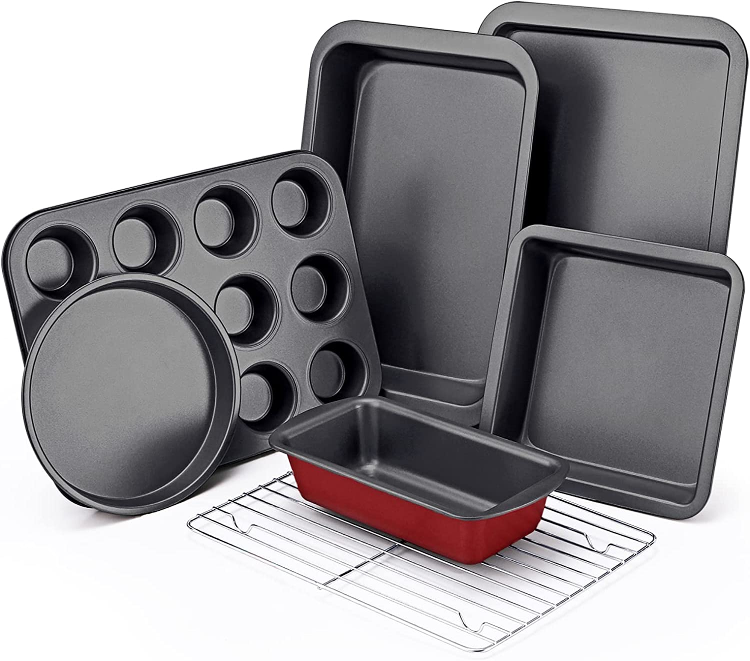 COMPLETE 7-PIECE BAKEWARE SET - Including a round cake pan, a square cake pan, a loaf pan, a cup muffin pan, a cookie sheet, a cooling rack, a deep roast pan. All pieces of our baking set were designed to fit neatly into one another, saving you valuable space in your kitchen cabinets. The nonstick baking pans set will fit into regular kitchen cabinets or under standard kitchen ovens. LONG-LASTING NONSTICK - The interior of each piece has interlocking non-stick layers that are designed to deliver long-lasting, high-performance release and ensure easy food release with zero leftover residue. The tough material of the oven pan set disperses weight and heat evenly throughout the baking process for perfectly made recipes that won't get stuck or caked on. HEAT IS NOT THE ENEMY - Unlike most silicone grips on the bakeware pan handles which are not enough to protect you from heat, our baking set includes one pair silicone oven mitts that are thick heat resistant potholders made from premium food grade material. Mittens are rated to protect you from heat up to 446F and help you to grip hot items safely in your kitchen. SUPERIOR CARBON STEEL - The heavy-gauge steel bakeware is made of high-quality and durable carbon steel that resists warping, popping, and bending, even in high temperatures of up to 482 F. The material is rust and scratch-resistant and is designed to last a lifetime. Plus, each piece of bakeware is lightweight for easy lifting! BAKE EASY & CLEAN EASY - Kickstart your baking aspirations with this all-in-one baking set. You’ll never have to hunt for missing baking pans again because all the pieces fit neatly into one box. Dishwasher safe for an easy cleanup (hand-wash for best performance). Baking pan set is backed by a quality assurance guarantee. We stand by our products 100% and want our customers to love them as much as we do!